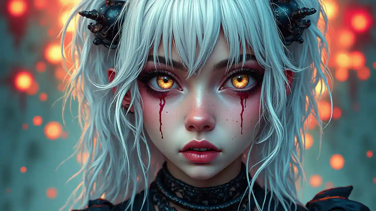 Cantik, wanita muda, mata air mata berasap, vivid, psychedelic, seni tinta gaya komik, alt, goth, setan, mode bergantian, punk, rambut putih,