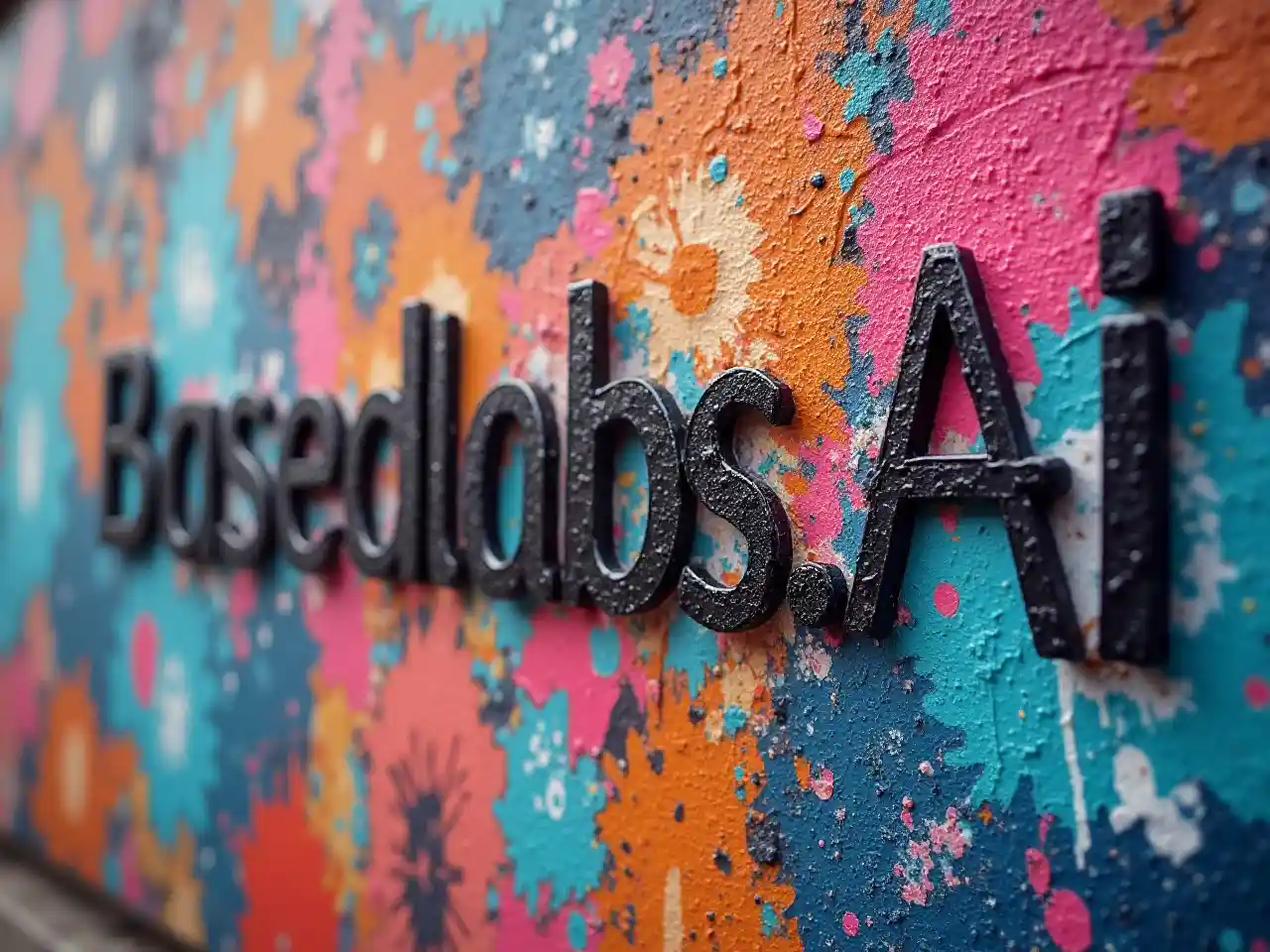 Foto dinding hidup ditutupi dengan grafiti gelap "Basedlabs.AI". Mungkin diambil dari ponsel.