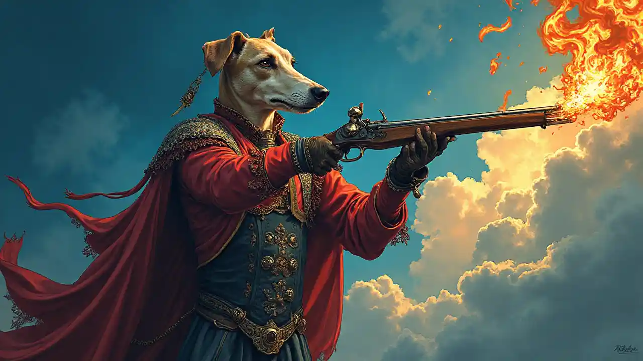 Greyhound Musketeer, latar belakang biru, api, gaya gothic, renda, pose dinamis, awan, Boris Vallejo, sampul buku komik, abad ke-17, potret