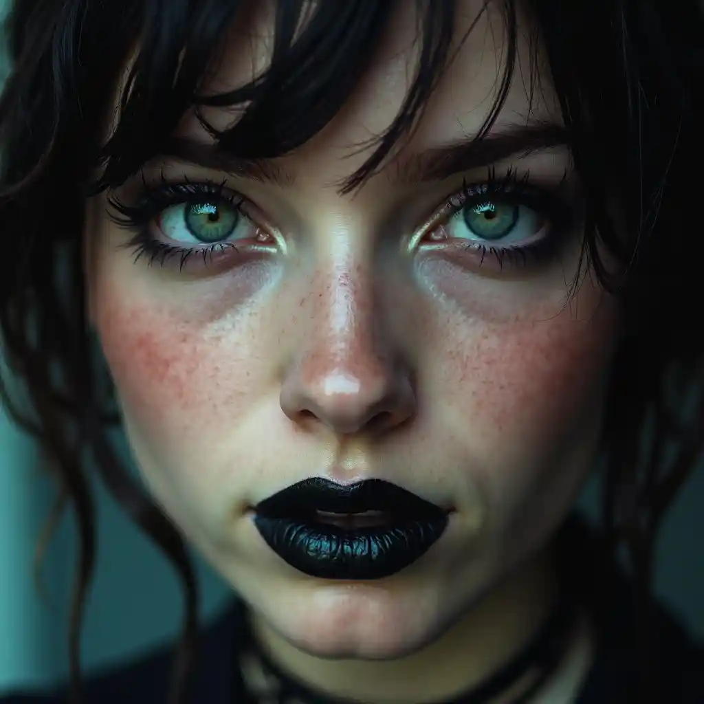 ScottEstetika, foto wajah close-up dari seorang gadis sampah yang mengenakan lipstik hitam dan eyeliner, foto artistik