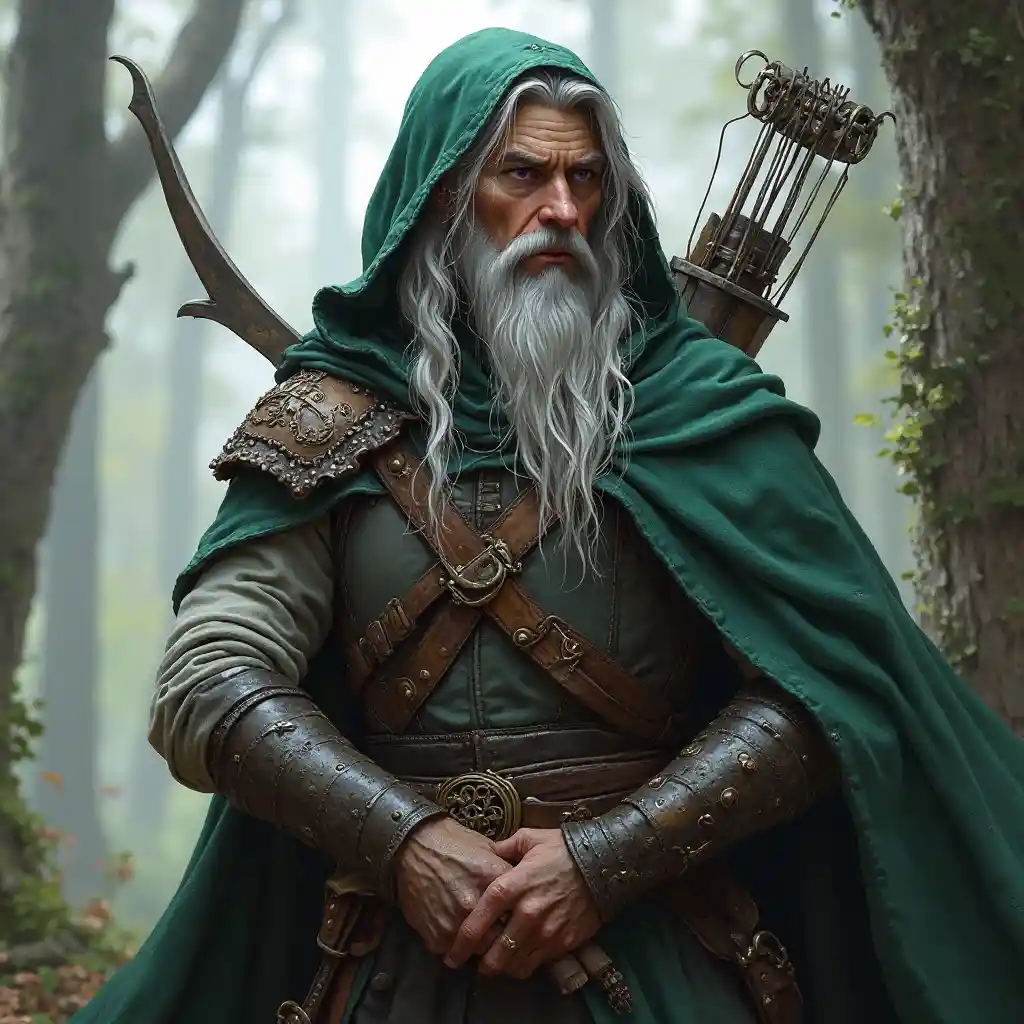 Penjaga hutan pria setengah elf, tinggi 6 kaki 4 inci, iris ungu ', kulit hitam terang, rambut panjang perak, janggut lingkaran perak tebal, berat 200 pon, sarung pedang elf, busur panjang penjaga hutan genggam, penutup jubah hijau hutan bertatahkan armor kulit