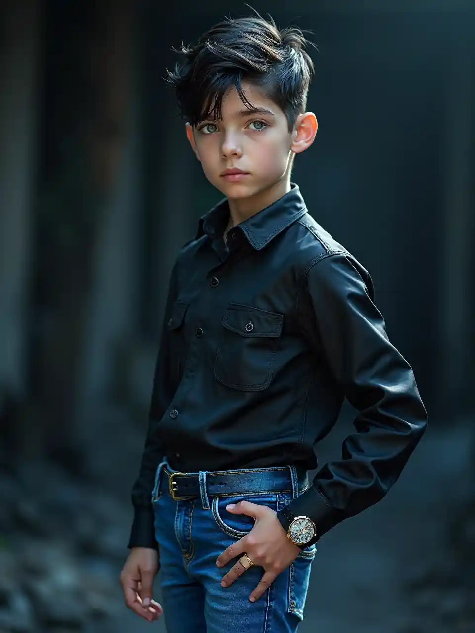 Seorang (((anak laki-laki yang sangat tampan))) berkulit pucat dan (((mengkilap, mata biru tua))), yang memancarkan semangat muda, mengenakan kemeja hitam halus dengan (((satin biru, efek setengah ciuman)), ((jeans biru)), dan satu (((putih, dengan finishing satin biru, pada sepatunya)), yang menonjolkan (tajam, fitur wajah yang dipahat). Rambutnya (pendek, efek hitam berantakan), dan dia berpose secara dinamis, dengan satu tangan di pinggul dan satu di tangan lainnya (((biru dan hitam paracord dengan jaket biru klasik dan sarung tangan)), memancarkan (modern, suasana luar ruangan). Dia dilengkapi dengan satu (ikat pinggang, pita biru-hitam), dan sepasang (mata biru yang menyilaukan), yang menonjol dengan (kemeja putih cerah) dengan hiasan satin biru klasik. Adegan diatur dalam (pencahayaan redup, lingkungan futuristik) yang berfokus pada wajah dan tubuh anak laki-laki, menampilkan (keren, gaya vintage) dan memancarkan (perkotaan, suasana luar ruangan)