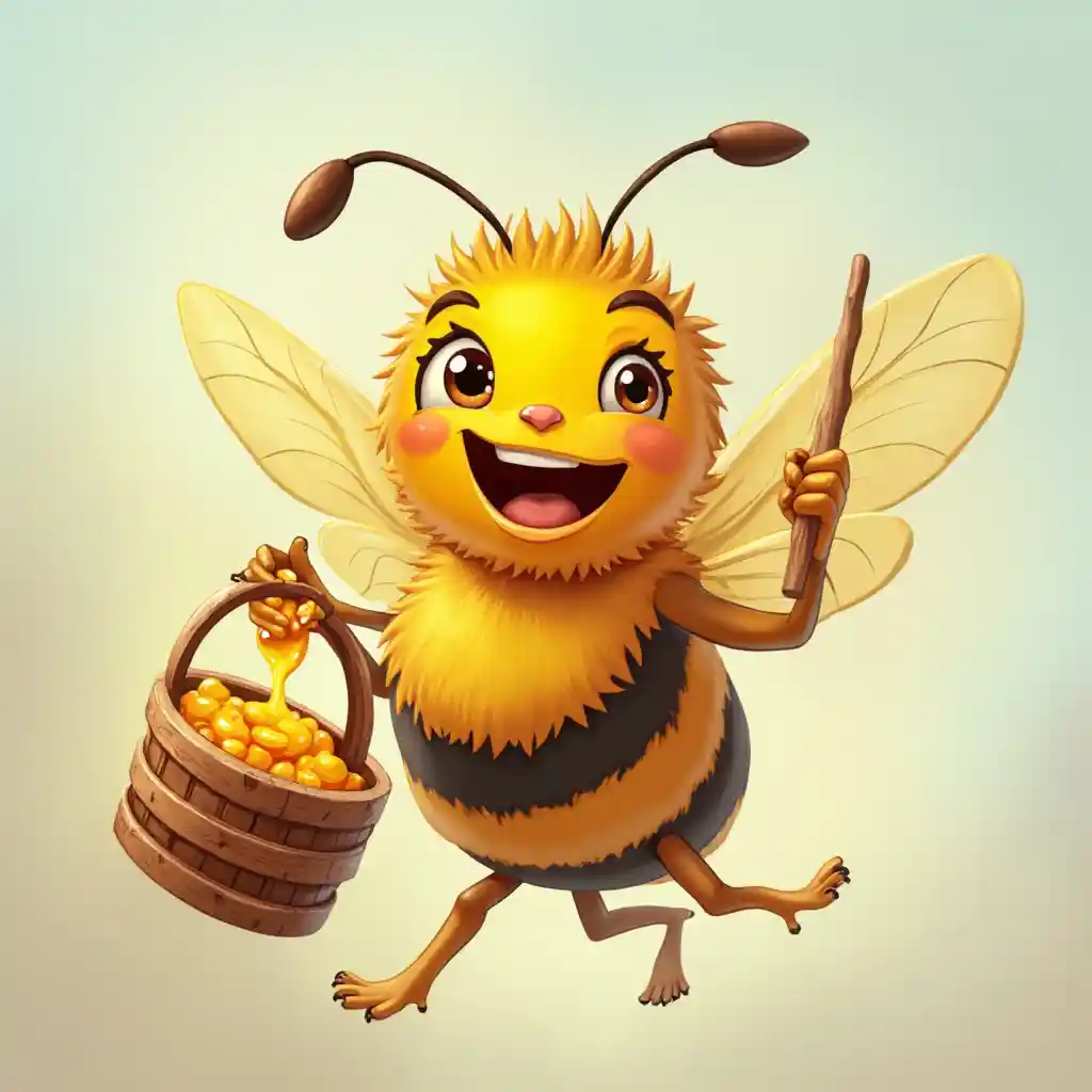 Gambaran lebah yang bahagia terbang, dengan ember penuh madu di satu tangan dan tongkat yang dicelupkan ke dalam madu di tangan yang lain.