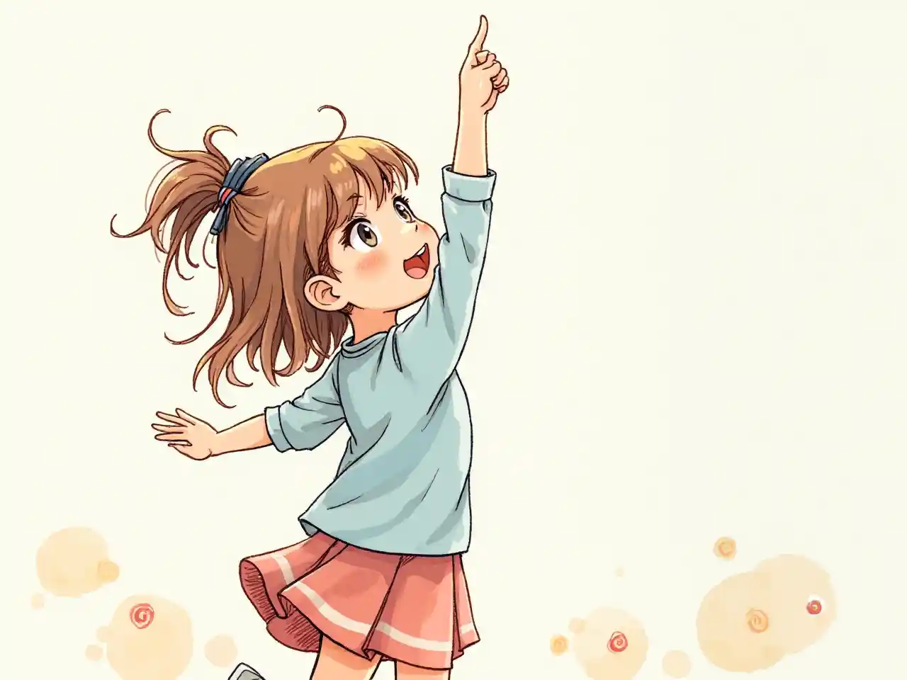 Ilustrasi gambar ceria seorang gadis cantik yang terlihat dari belakang, tangannya mengarah ke kanan dan dengan senang hati menjulur ke depan. Yang digambarkan adalah gaya sketsa tinta yang lucu, dihiasi dengan warna-warna ceria. Ilustrasi menggambarkan seluruh tubuh seorang gadis berusia sembilan tahun dengan kedua tangan diangkat ke sisi kanan. Dia mengenakan rok dan kemeja lengan panjang yang meningkatkan kelucuan keseluruhan karya seni.