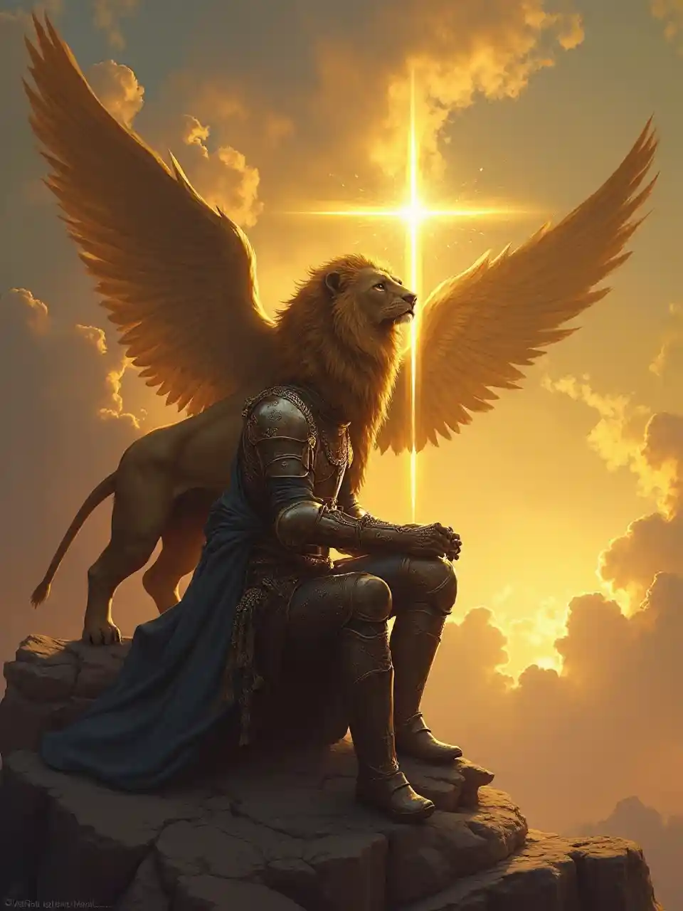 JosephSamurai Quan Jia berlutut di samping singa surgawi, salib emas Behid berkilau dan penuh dengan sayap