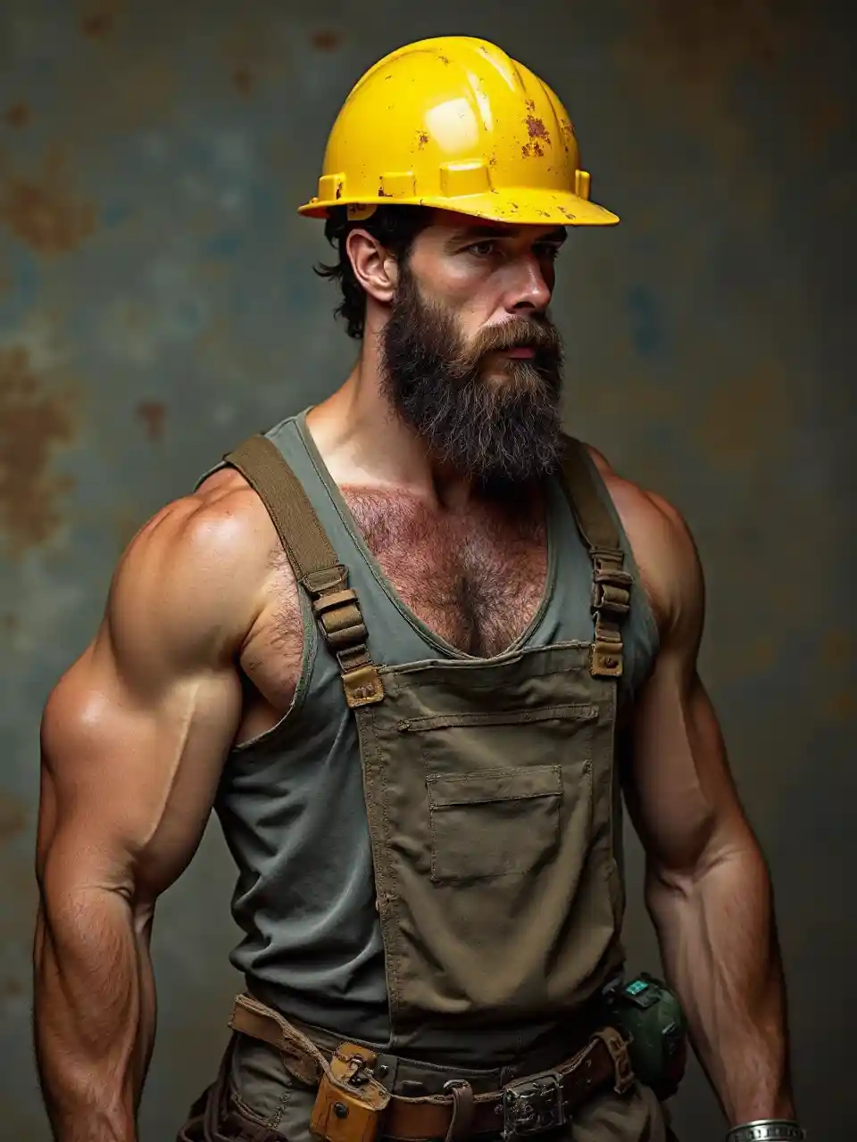 Seorang pekerja konstruksi berjenggot, mengenakan pakaian kerja, berotot dan berkeringat, mengenakan topi keras kuning dengan sikap pahlawan antik Yunani