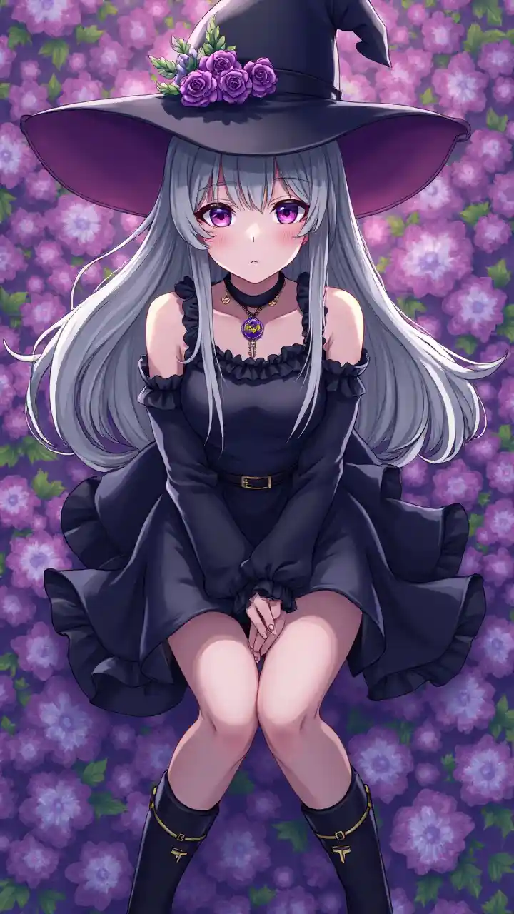 1girl, the Herta, PPG _ menonjol, latar belakang warna-warni, warna-warni, cetak bunga, tema ungu dari atas, sudut dinamis, duduk, kaki silang, tanpa ekspresi, bibir terpisah, topi, rambut panjang, melepas lengan, perhiasan, gaun, topi penyihir, anting-anting, bunga, poni, bunga topi, kalung, kunci, gaun hitam, alas kaki hitam, lengan ruffle, tiara hitam, rambut abu-abu, ruffle, lengan panjang, salib, bunga ungu, stoking, Sepatu bot, sepatu bot di atas lutut, kalung kunci, cincin kaki, (mahakarya, kualitas terbaik), hasil terbaik, anatomi terbaik, super-off, kualitas menakjubkan, sangat estetis, absurd, highres, terbaru, HDR, 8K, seni warna RAW detail tinggi, kontras tinggi, wajah cerah, pupil besar, bulu mata, kulit cerah, bersinar
