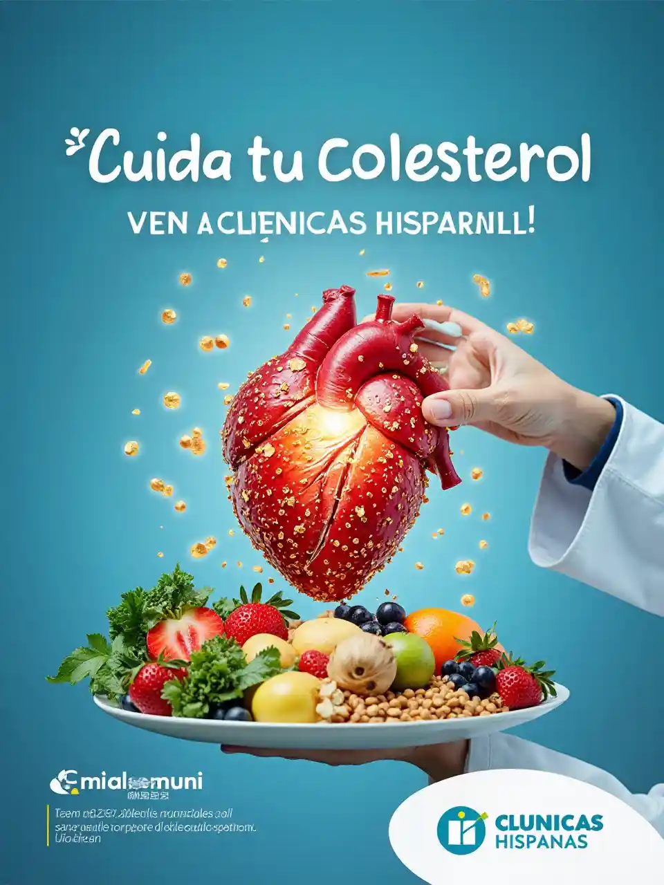" Una imagen promocional impactante y profesional sobre el control del colesterol para las Cl í nicas Hispanas:un coraz ó n humano brillante y saludable rodeado de part í culas doradas que simbolizan la vitalidad,junto a un plato con alimentos saludables como frutas,verduras y granos integrales。Un m é dico sonriente con bata blanca se ñ ala el coraz ó n,destacando la importancia del cuidado de la salud。El texto destacado dice:' ↓ Cuida tu colesterol!Ven a Cl í nicas Hispanas para checos y orientaci ó n m é dica '。Fondo limpio y moderno en tonos azules y blancos que reflejan profesionalismo,con elementos visuales din á micos como gr á ficos de salud y se ñ ales de progreso。El logotipo de las Cl í nicas Hispanas sutilmente incorporado en la parte below. "