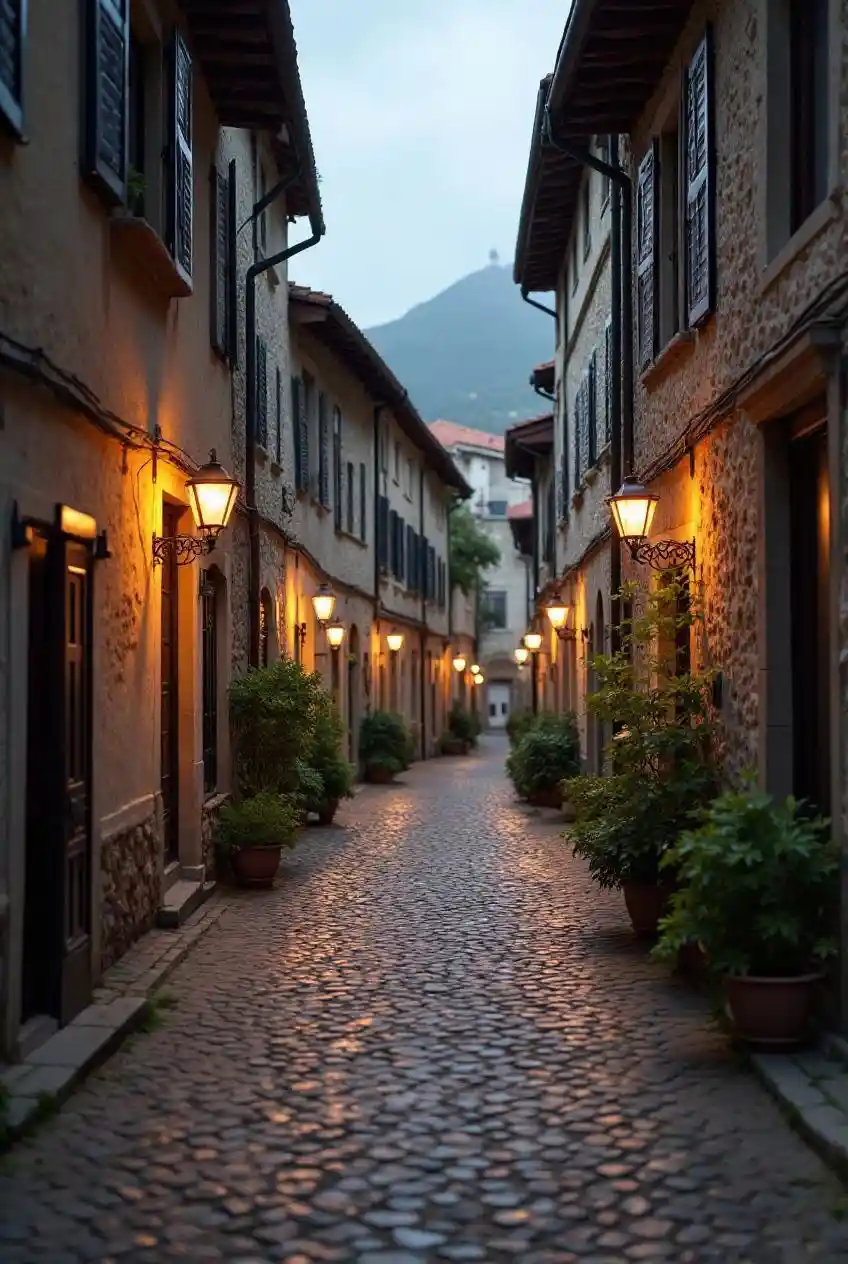 Cobblestone streets of a medieval town, with lanterns lighting up historic facades.