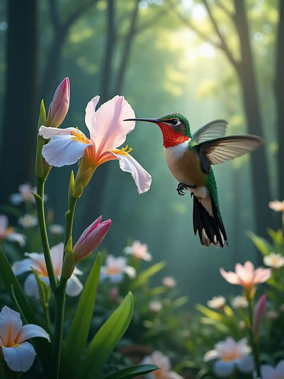 Burung kolibri yang cantik mengambil nektar dari bunga iris yang cantik dengan warna bunga biru, kuning, dan merah muda, sedangkan burung kolibri berwarna hijau, merah, merah muda, dan kecoklatan seperti burung kolibri biasa. Latar belakangnya adalah hutan yang dipenuhi dengan pepohonan dan tanaman yang berwarna putih dan hijau
