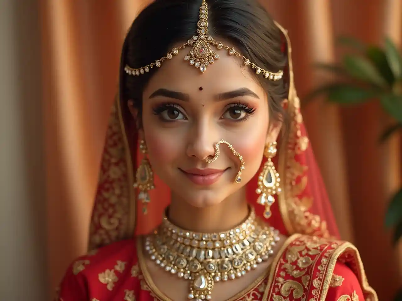 Pengantin India yang indah mengenakan perhiasan berlian dengan latar belakang elemen pernikahan tradisional India. Foto Realtime