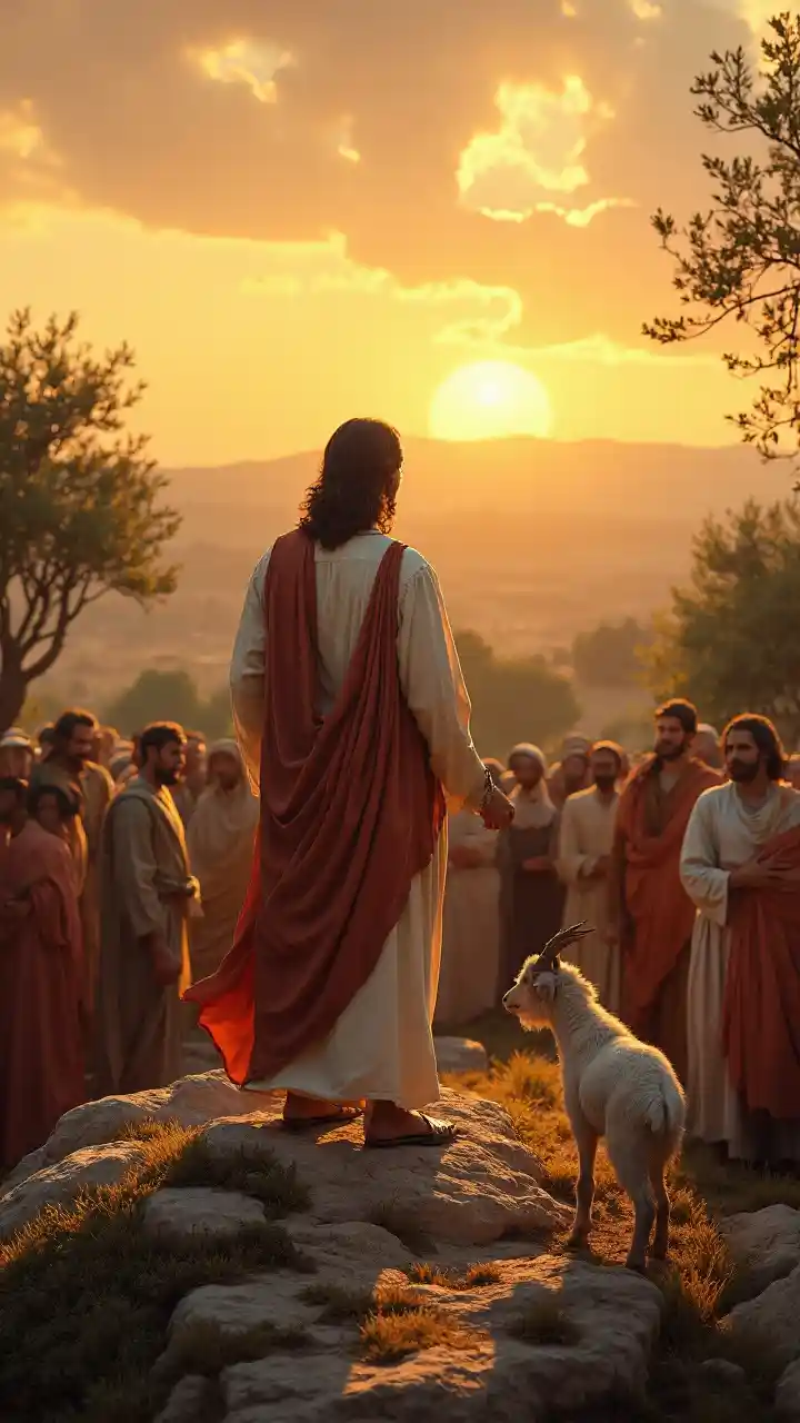 Yesus berkhotbah di atas gunung. Dia berdiri secara misterius, memancarkan dewa yang ditempatkan di tubuhnya. Rendah hati dan suci. Anak Allah dipersonifikasikan. Yesus dikelilingi oleh banyak orang yang sedang mendengarkan khotbah-khotbahnya. Pemandangannya indah. Ini adalah pemandangan pedesaan yang kasar di Yerusalem, di mana Yesus berdiri di puncak gunung. Adegan diatur di dekat Yesus. Kota Yerusalem pada zaman Yesus berada di latar belakang. Pohon zaitun tumbuh di atas bukit. Dan seekor kambing dan seekor domba terlihat memberi makan. Yesus memakai pakaian yang sama dengan yang dipakai pada waktu itu dan memakai selempang. Matahari terbenam di barat, dan langit adalah matahari terbenam emas.
