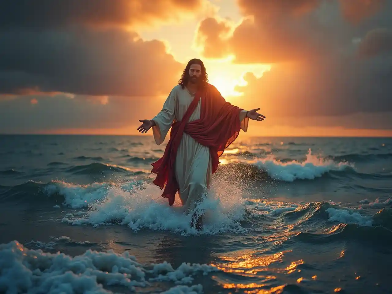 SkylarQuiero hacer una publicacion en facebook y mecesito una image de jesus cristo caminando sobre las aguas del mar con fundo azulado oscuro y rojoanaranjado en el cielo