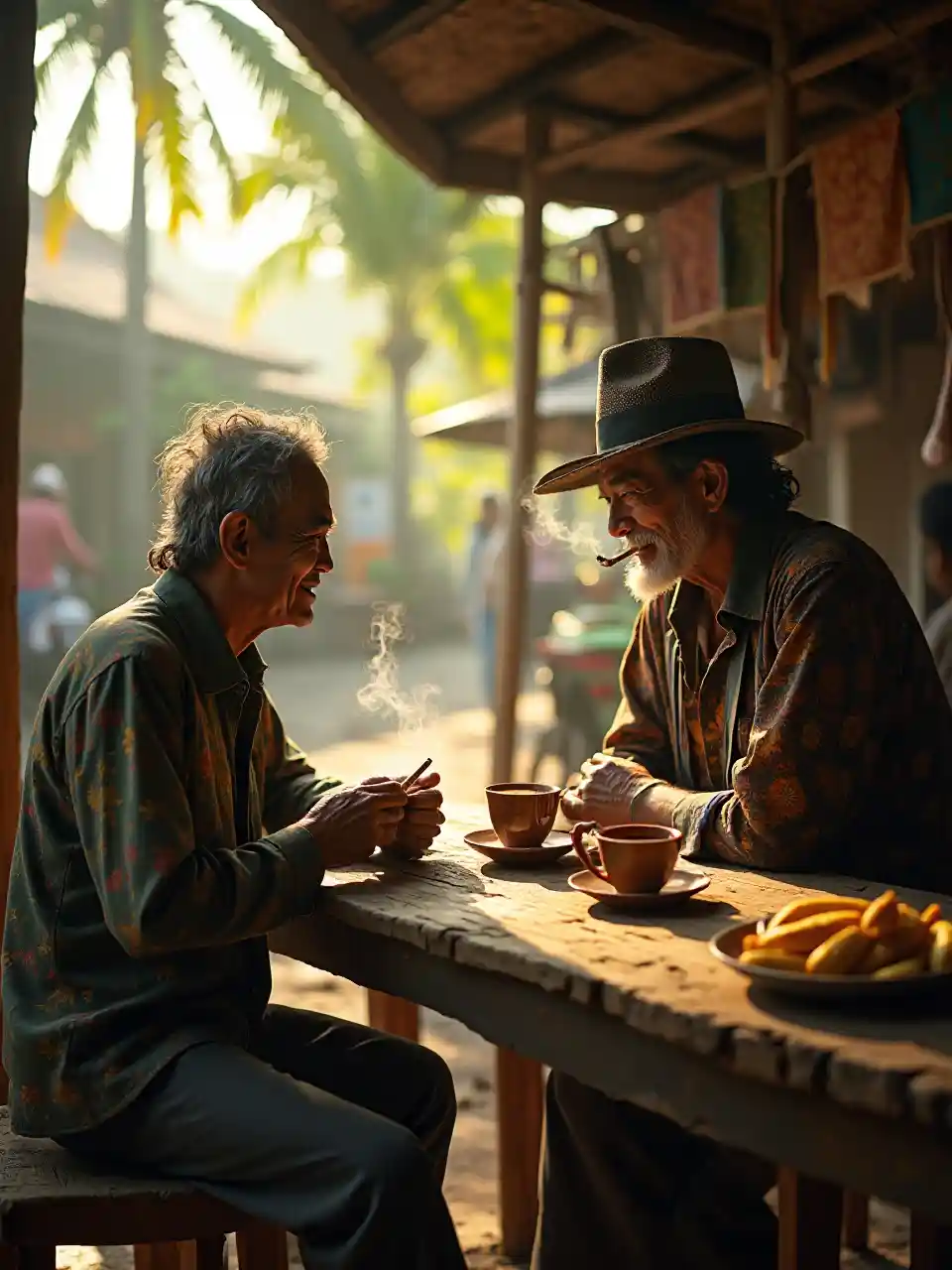 Dalam adegan film, seorang tetua desa yang sudah kenyang berbagi momen tenang, penuh ketegangan dengan Joker dalam "warung kopi" tradisional Jawa, Joker dengan santai bersandar di loket bambu. Warung dengan bangku kayu pedesaan dan tirai batik pudar ini berdiri di tepi pasar jalanan Solo yang ramai. Sinar matahari selama prime time disaring melalui daun palem, menciptakan bayangan panjang di atas cangkir keramik yang retak, berisi kopi tubruk tebal (kopi hitam Jawa) dan sepiring pisang goreng (pisang goreng). Badut itu mengenakan setelan adat bermotif batik dengan motif bunga yang berantakan, senyum meliuk-liuk, dan rokok kretek di tangannya, berasap di udara lembab. Tetua ini mengenakan topi paige yang diasah dan sarung yang pudar, mencengkeram cangkir dengan erat, dan matanya menunjukkan campuran rasa ingin tahu dan gelisah. Di belakang mereka, ada latar belakang budaya Solo yang dinamis; becak sepeda (' becak ') yang ditumpuk dengan kain batik, pedagang kaki lima yang sedang memanggang, dan Istana Mangkunegara yang ikonik terlihat di kejauhan. Diambil dengan kamera Canon EOS R6 Mark II Ultra HD dan lensa seni Sigma 50mm f/1.4 DG HSM, scnene menekankan kontras antara energi anarkis Joker dan nuansa pedesaan Jawa yang tenang dan bersahaja. Cahaya alami menyoroti partikel debu yang berputar-putar di udara, sementara kedalaman bidang yang dangkal mengaburkan pasar yang kacau menjadi kabut yang hangat dan seperti lukisan.