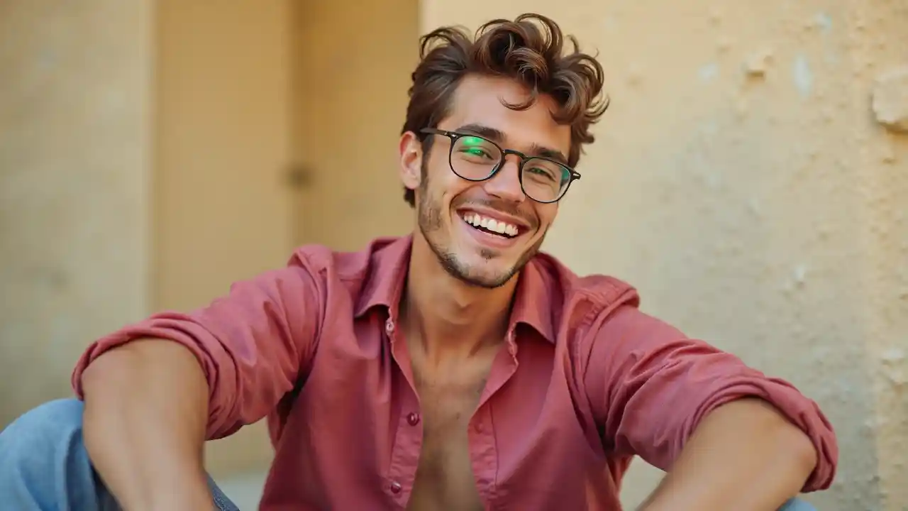 Seorang pemuda duduk dengan nyaman di tanah, tersenyum lebar, menyiratkan sikap main-main. Kacamatanya yang trendi, dilengkapi dengan aksesori yang unik, memberikan kontribusi nuansa yang menyenangkan untuk penampilannya, sementara kemeja merah tua yang dikancingkan kontras dengan warna latar belakang yang lembut, yang ditandai dengan dinding bertekstur ringan. Adegan cerah dan ceria, menyiratkan hari yang cerah, dan pose santai subjek menekankan sikap santai dan riang. Palet warna yang hangat dan fokus yang lembut di sampingnya meningkatkan suasana yang menggoda dan menangkap momen kegembiraan dan spontanitas.