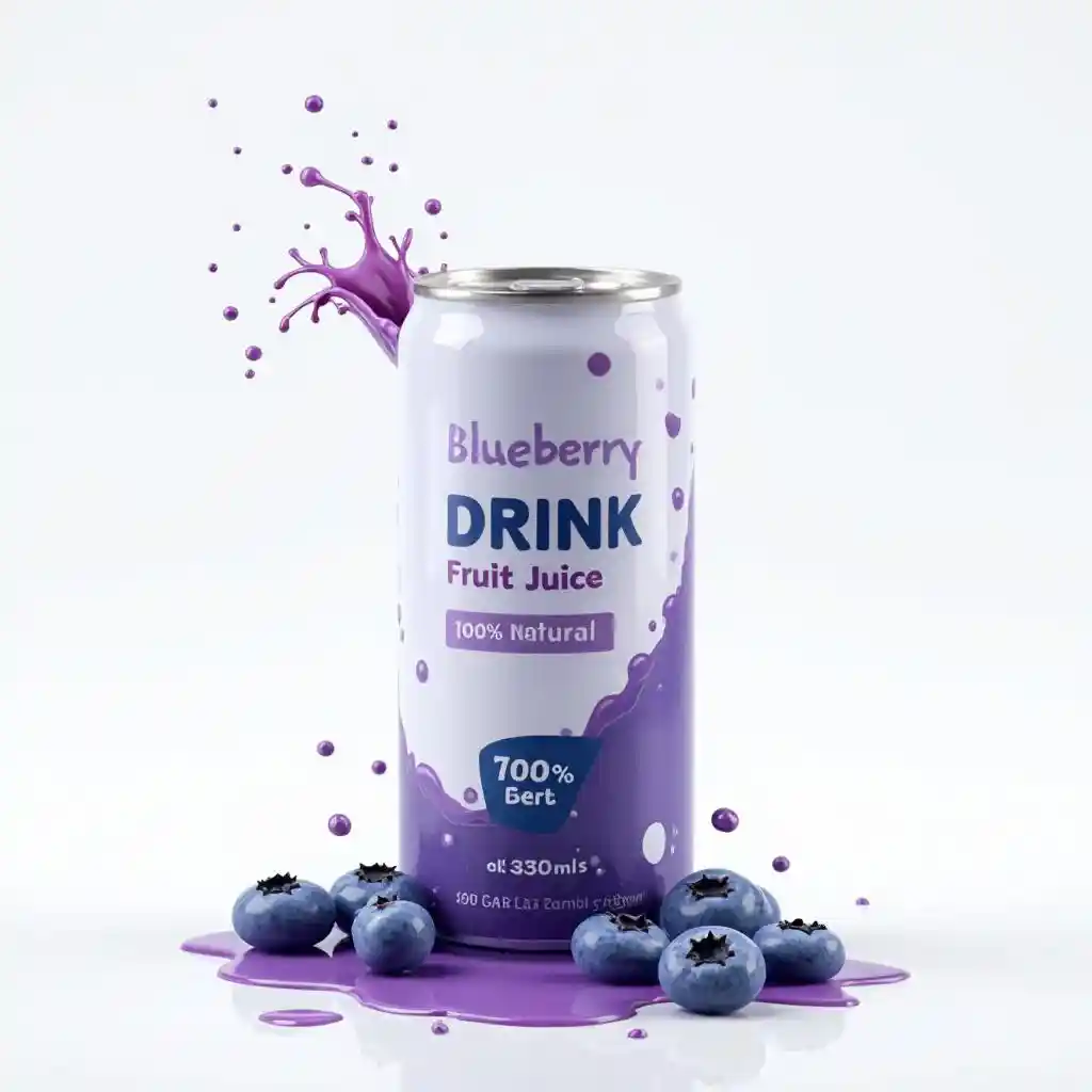 Gambar ini menggambarkan desain kaleng minuman yang stylish dan modern untuk **Jus Rasa Blueberry **.Ciri-ciri toples adalah **Dasar putih sederhana **Menonjolkan yang dinamis **Purple Liquid **Percikan dari atas, menambah kesegaran. Besar, **Realita Blueberry **Terendam dalam kolam jus di bagian bawah, menekankan bahan-bahan utama. a**"100% alami" **Label ditempatkan secara strategis untuk menunjukkan kemurnian produk. WordPress.org **"Blueberry Drink" **Dan **"Juice" **Sorot dengan huruf tebal dan sederhana, memastikan kejelasan. The**330ml **Untuk kenyamanan konsumen, ukuran ditandai dengan jelas. Desain keseluruhan mengusulkan produk yang menyegarkan dan alami yang menarik konsumen yang sadar kesehatan.
