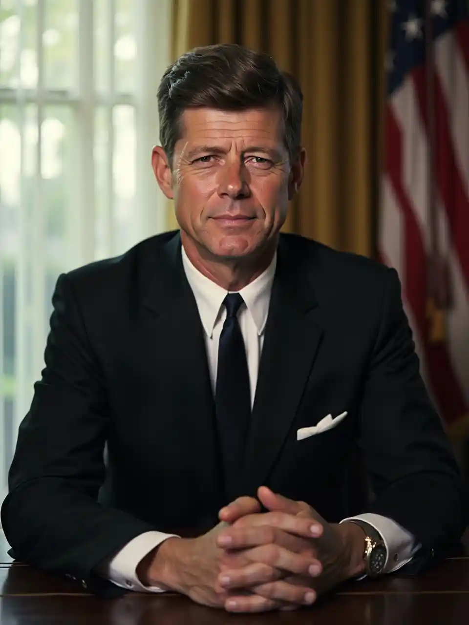 Potret John F. Kennedy dalam setelan hitam, potret di ruang oval Gedung Putih, fokus yang jelas, detail yang tinggi, gaya vintage