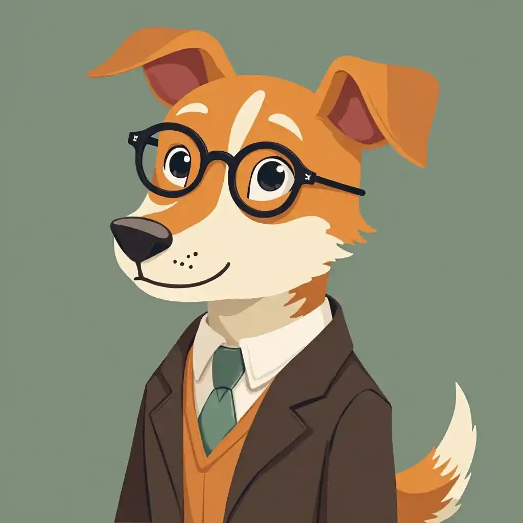 SkylarKids art, ahli sejarah anjing vektor seni gaya minimalis, dengan kacamata, kain formal, karakter gaya duolingo, kids art