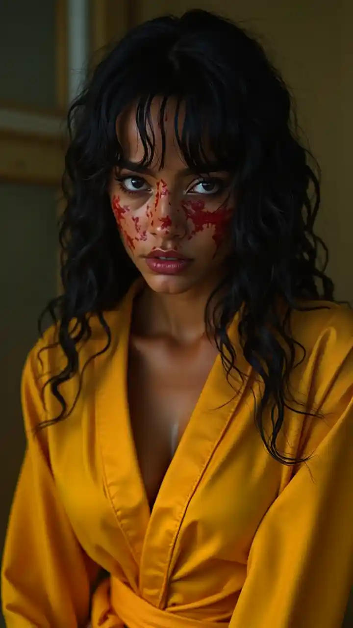 laaaaraFilm Kill Bill, Potret Wanita Kulit Hitam Berjubah Kuning dengan Wajah Berlumuran Darah