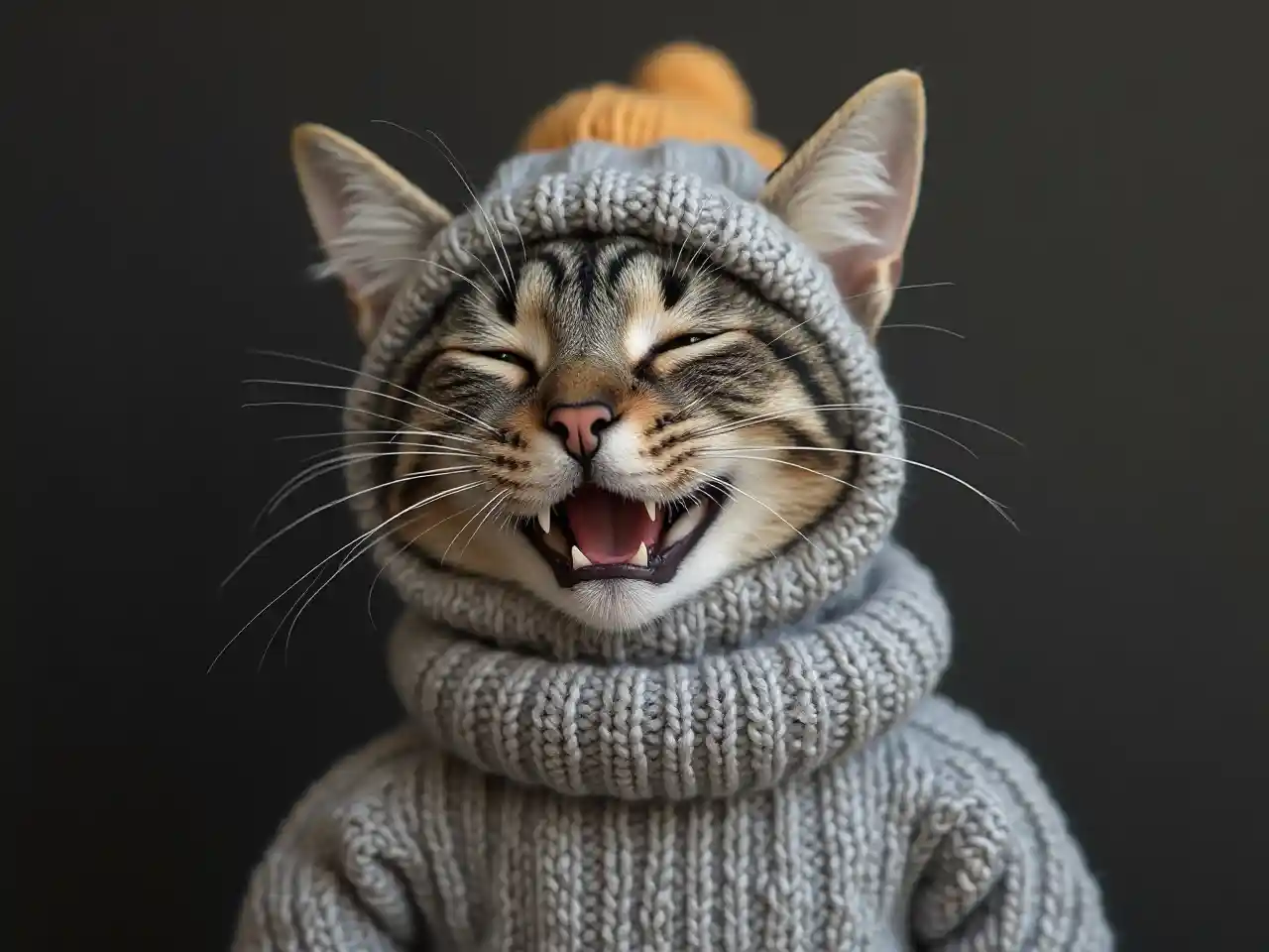 Kucing menenun abu-abu tersenyum dan memakai topi