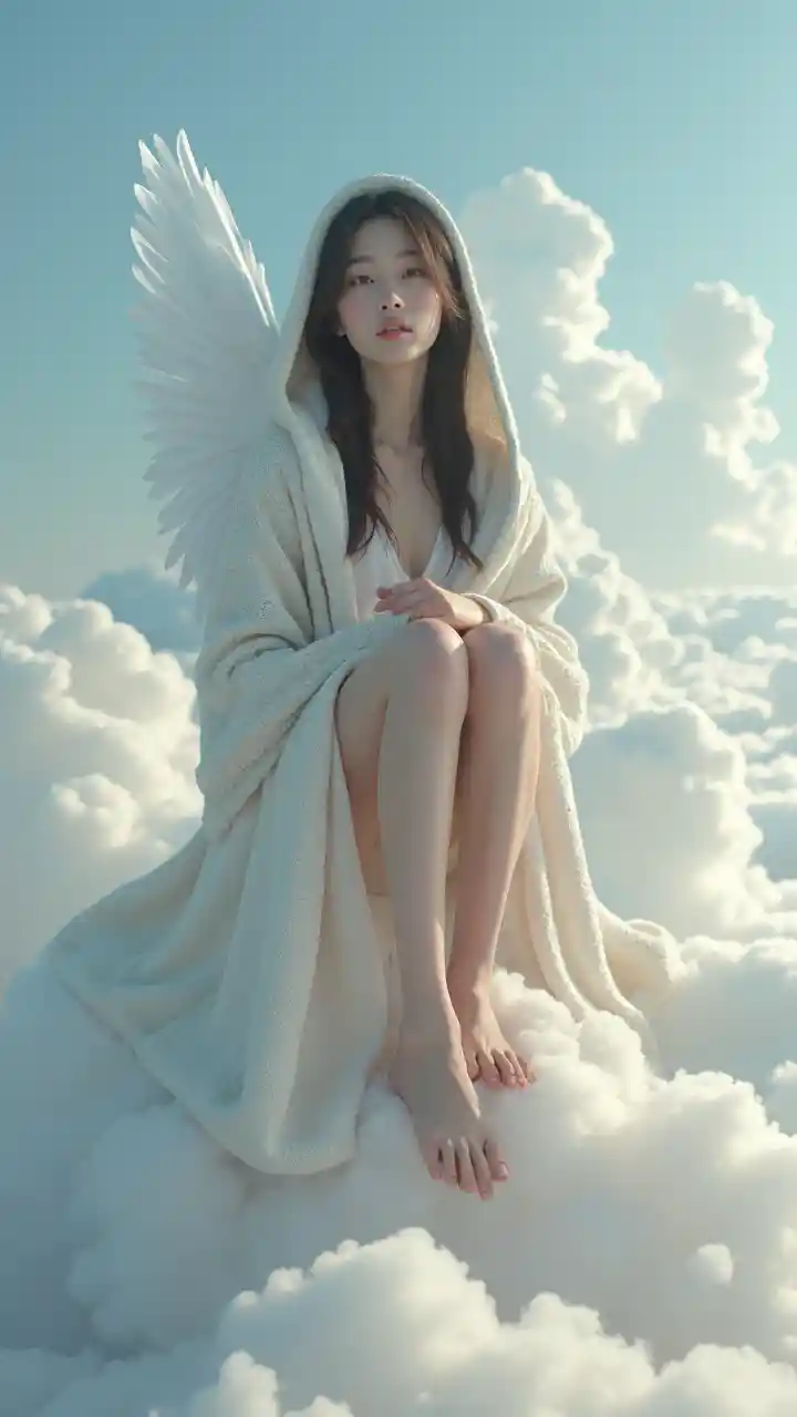 Malaikat wanita korea duduk di atas awan di langit, hanya mengenakan baju rajut berkerudung kebesaran, seluruh tubuhnya, foto, Terlihat paha, Super rinci, Super realistis, sangat rinci, AI mendefinisikan indah indah, benar-benar ultra-realistis muda dewasa Korea, cantik dan rinci fitur wajah, proporsi tubuh yang sempurna, super pucat, super glamour, HDR, UHD, resolusi tinggi, 64k, sinematik pencahayaan, efek khusus, HD oktan Artgerm