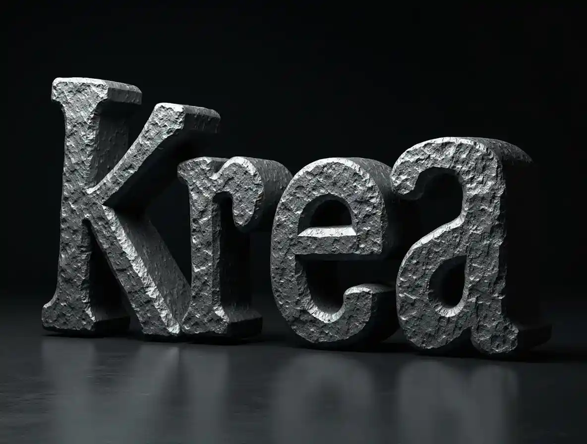 3D render Sebuah huruf bengkak lemak perak besar yang bertuliskan '' KREA '', diukir menjadi batu untuk mengisi seluruh halaman, tidak ada latar belakang yang terlihat, artistik, sangat abstrak font akira artistik, cahaya gelap, latar belakang hitam terkecil, usia ruang