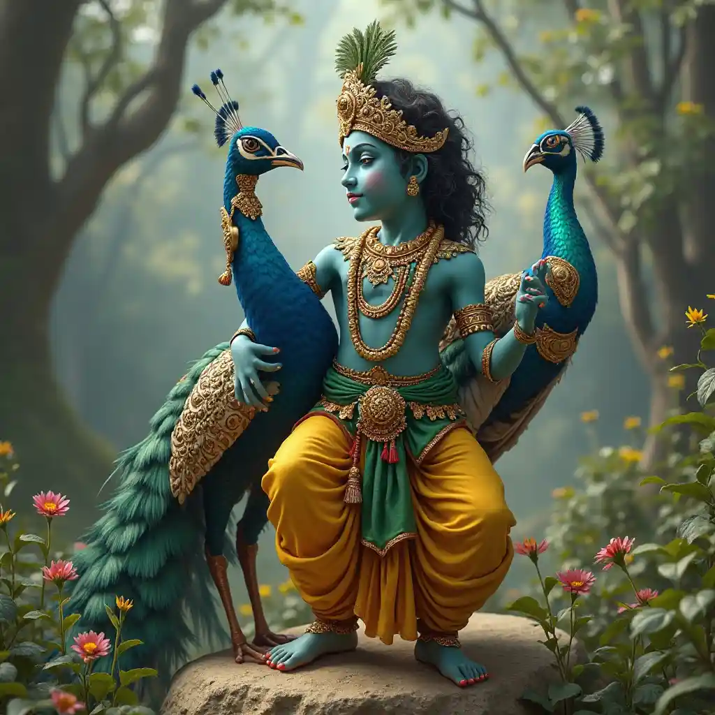 Lord Krishna dengan Burung Merak di Dunia Fantasi