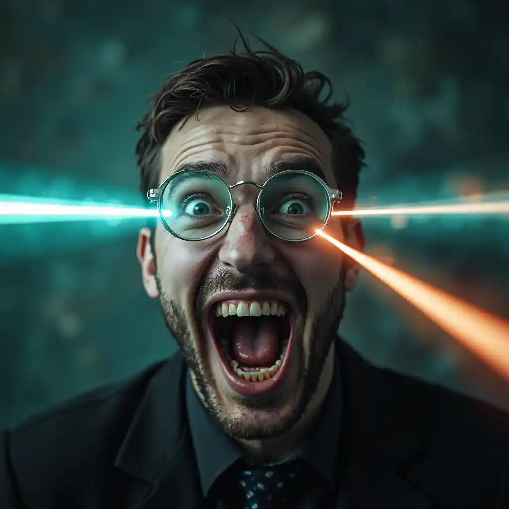 Seorang pria berkacamata menembakkan sinar laser dari matanya sambil tertawa, seperti orang gila