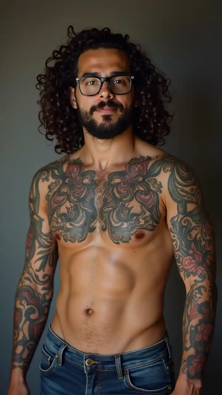 Seorang pria Latino, bertato, berkacamata, berjenggot dan bertubuh ayah dengan rambut keriting panjang → rambut keriting panjang