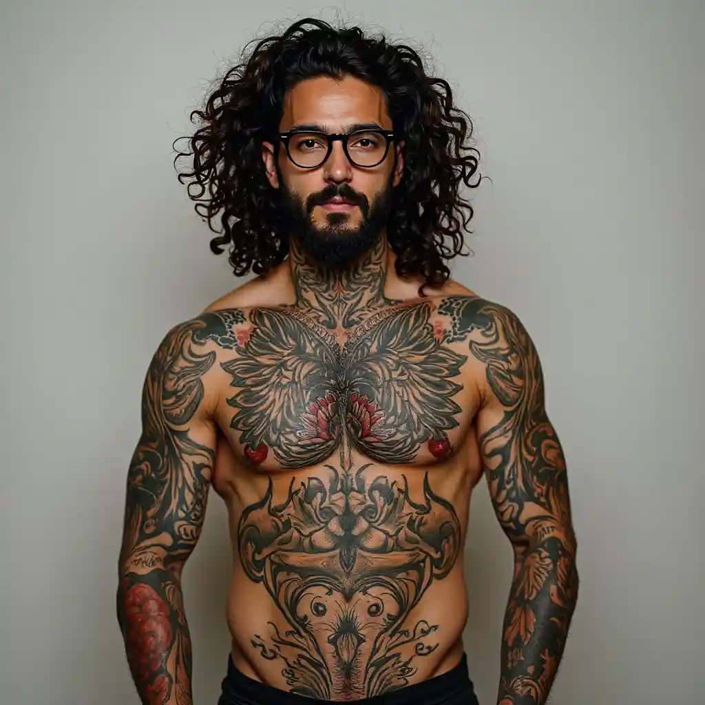 Seorang pria Latino yang mendapat tato, kacamata, jenggot, dan sosok ayah dengan rambut keriting panjang