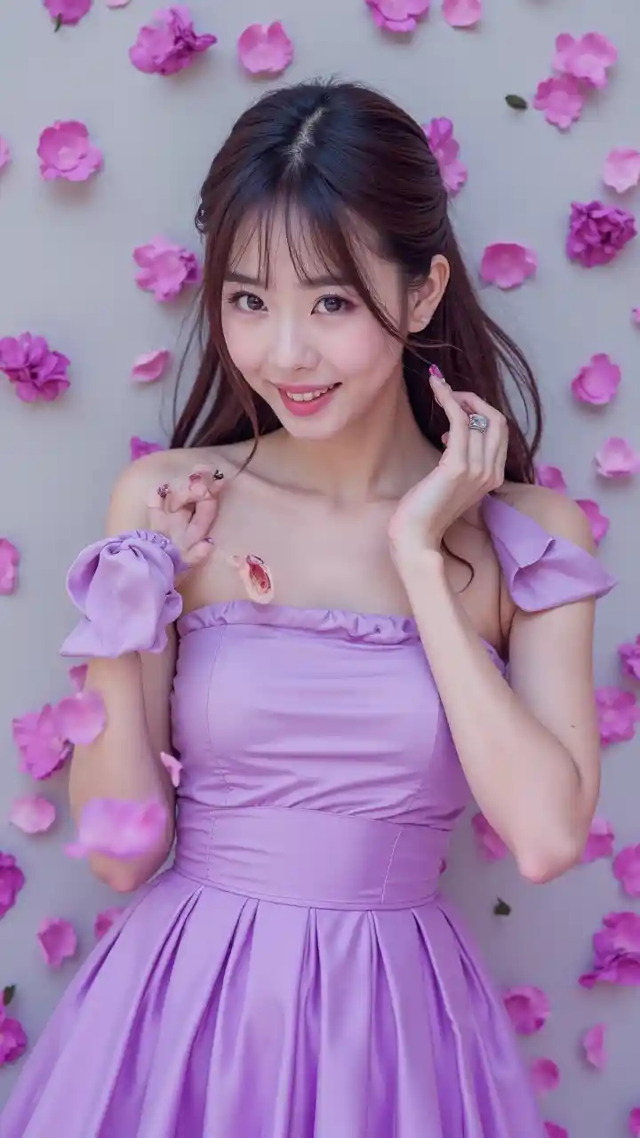 Idola KPop Korea Dikelilingi Kelopak Bunga Dengan Gaun Warna Lavender