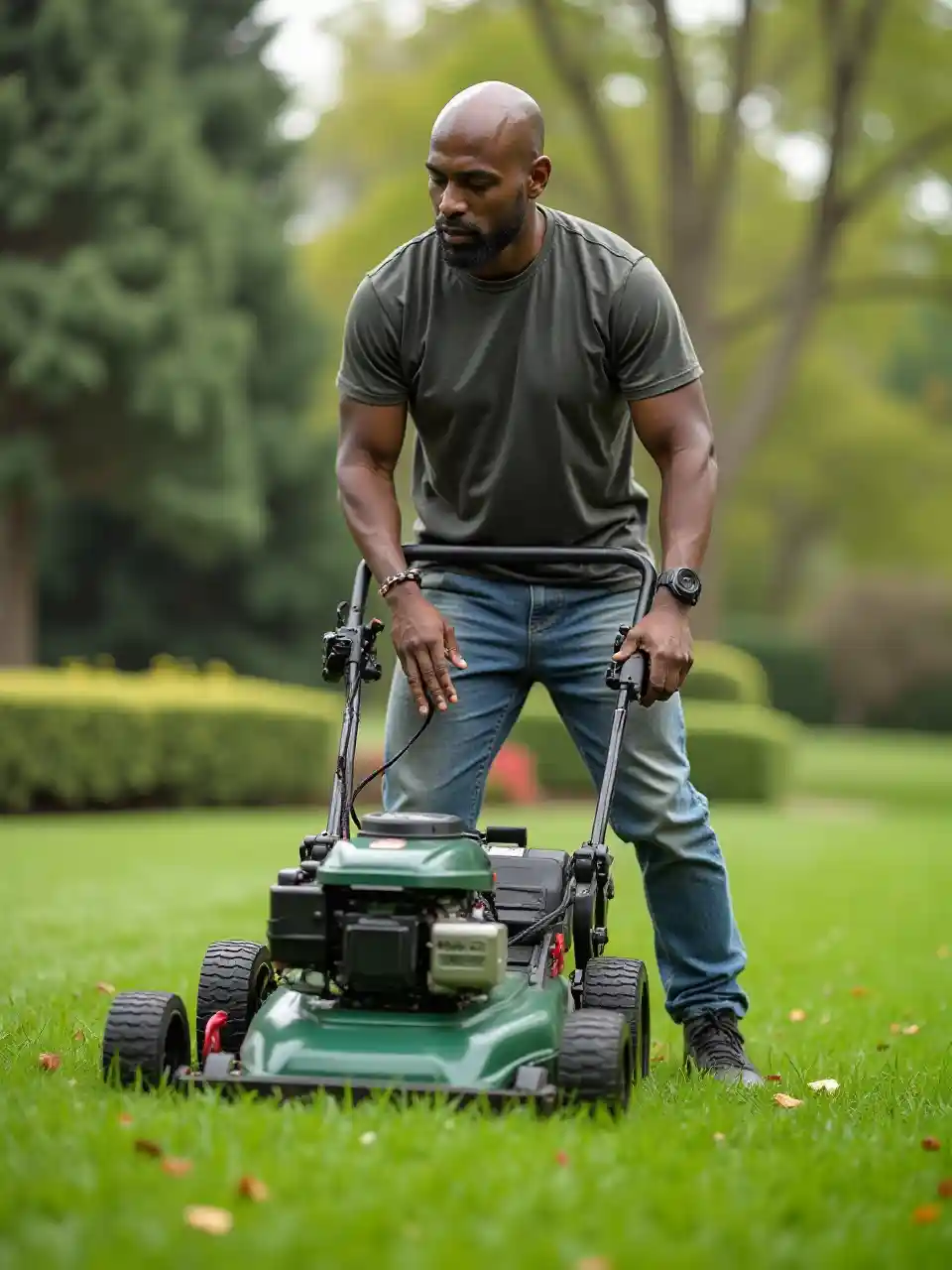 Membuat visual seorang pria kulit hitam botak yang tampan melakukan perawatan rumput