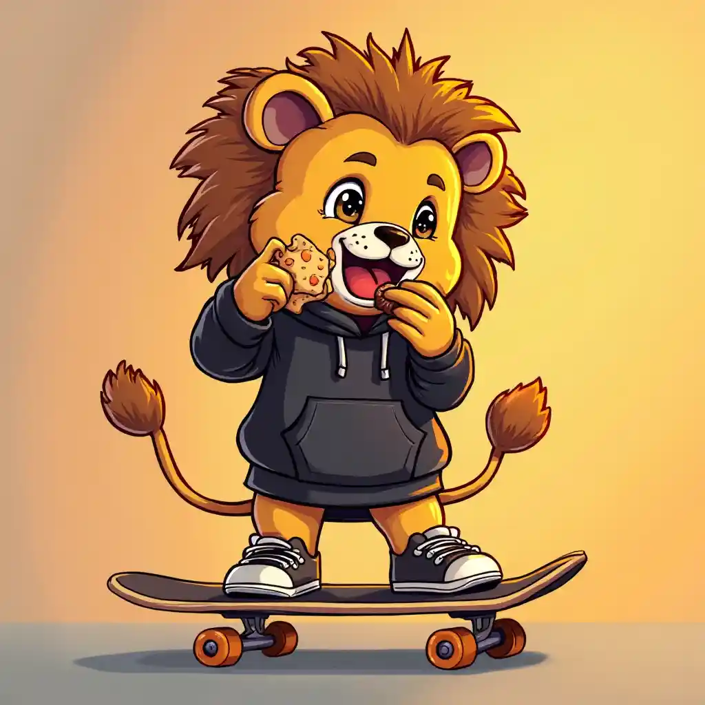 Karakter singa maskot lucu makan keripik kentang, memakai hoodie hitam, di skateboard, kuning kentang, funko pop, latar belakang gradien hidup,