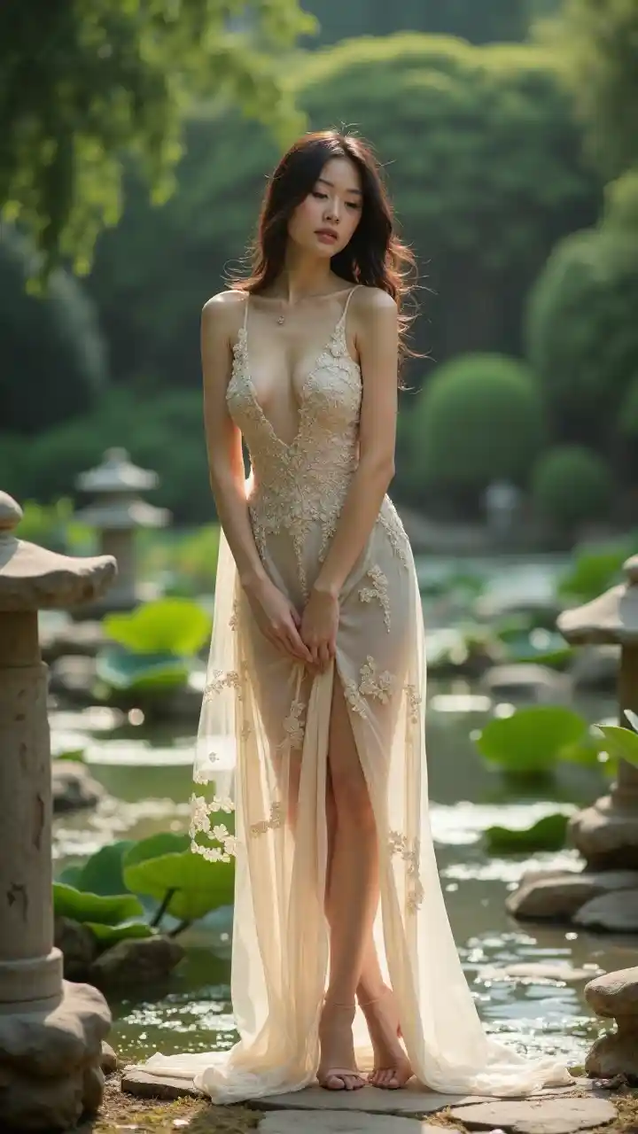Seorang wanita Asia berusia 30-an berpose di taman yang penuh dengan bunga teratai, berkilauan dalam gaun bordir murni. Lentera batu dan kolam koi membingkainya, dan kakinya yang panjang dan dadanya yang menonjol memancarkan keanggunan spiritual dan daya tarik yang menggoda di lingkungan yang tenang dan suci.