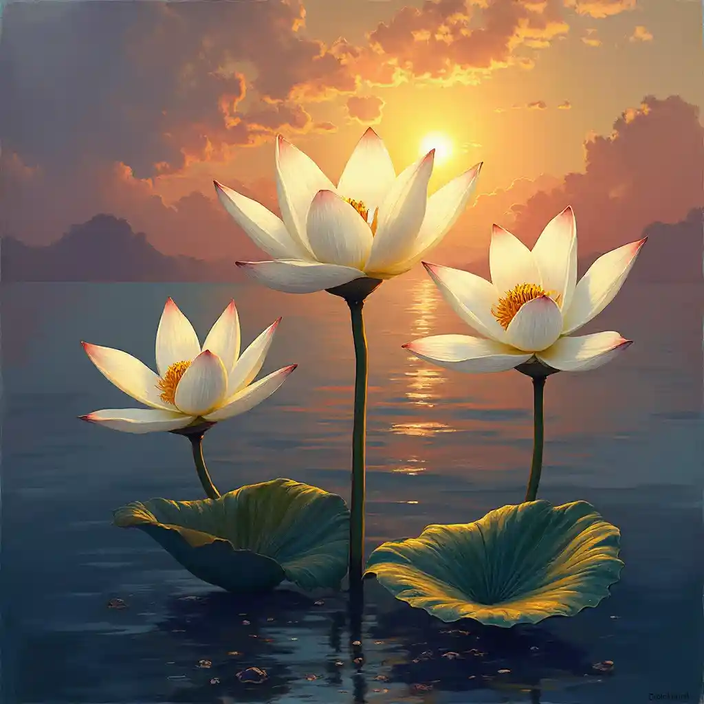 Dalam suasana yang tenang dan misterius, tiga bunga teratai yang megah mekar, melambangkan metamorfosis, pertumbuhan spiritual, kelahiran kembali, dan penciptaan di bidang mitologi Mesir. Bunga-bunga ini, dengan kelopak cangkir yang rumit dan pusat emas, naik dari air biru gelap yang keruh, dan tangkai panjang mereka dihiasi dengan dedaunan dengan pola hieroglif yang rumit. Saat matahari terbit, bunga teratai menyebar kelopaknya, secara bertahap mengungkapkan keindahan yang murni dan putih, dan ketika malam tiba, mereka perlahan-lahan menutup dan turun di bawah air. Bunga-bunga melapisi langit yang hangat dan bergradasi, dengan rona oranye, merah muda, ungu, membangkitkan perasaan damai. Estetika keseluruhan adalah keanggunan yang tenang, dengan goresan yang berani dan ekspresif, dan warna-warna yang hidup, seperti permata, seolah-olah diterangi oleh cahaya keemasan dewa-dewa Mesir kuno.