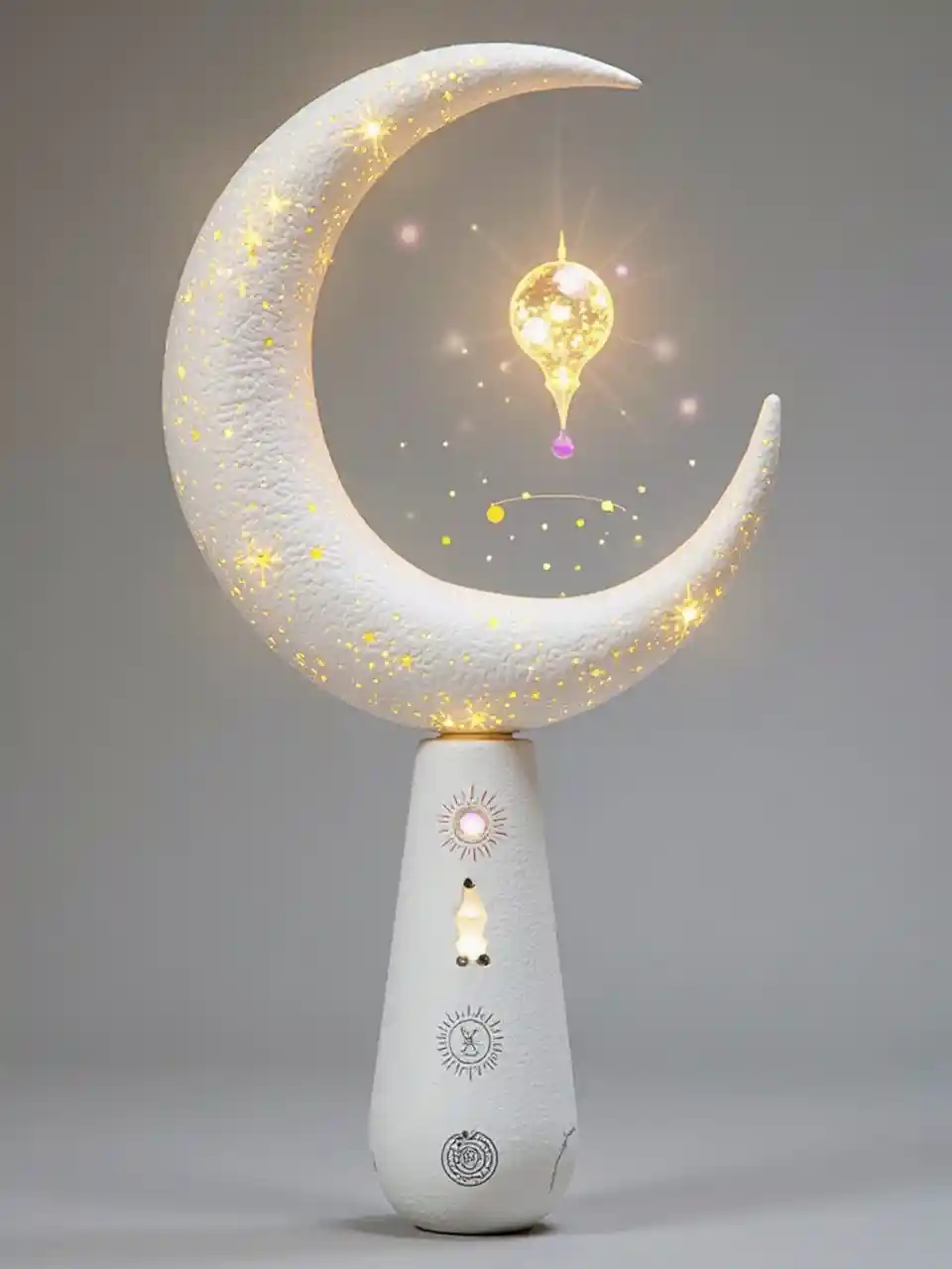 Kepala: Bulan sabit bercahaya dengan bola kristal berputar di tengahnya. Di dalam bola: Lima bintang kecil atau permata - masing-masing melambangkan anggota - dengan cerdik dikodekan dengan warna. Pegangan: Matte putih dengan kilau warna pelangi; terukir dengan logo LUNARIA dan pola rasi bintang. → perubahan warna