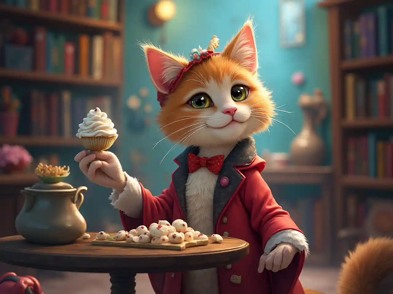 Potret Kitty si penyihir! Oh, kau kucing ajaib, lukislah toko seperti ini, di sini kita bisa membeli buku dongeng warna-warni kacang, mimpi ajaib, teko tawa, sekantong permen:: Bulu panjang bergelombang, mata besar ekspresif:: fantasi halus kabut super detail Thomas Kincaid:: Pixar, seni konseptual, latar belakang warna cerah, sinematik, dibayangkan kembali oleh cahaya industri dan sihir, pasca-pemrosesan resolusi 4K