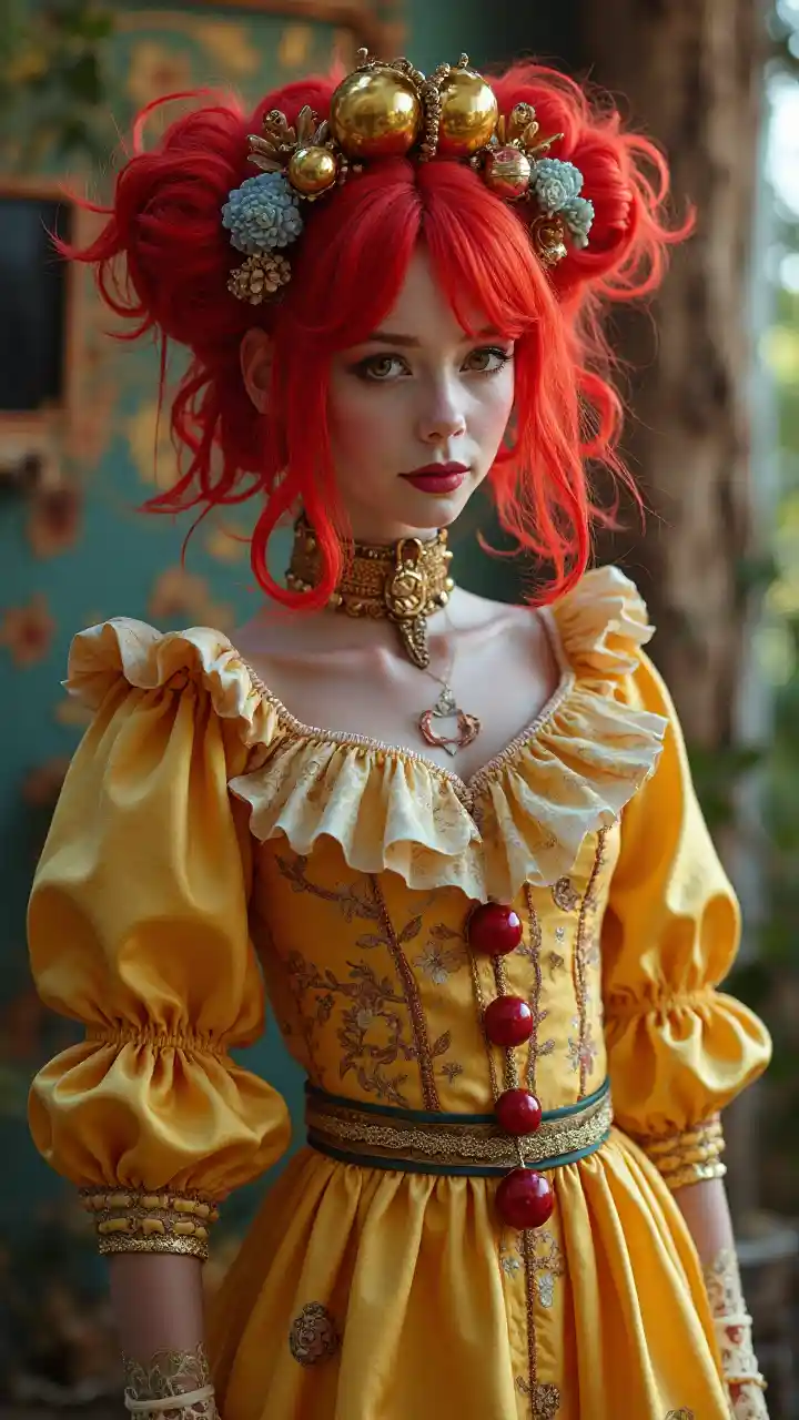 Adegan aneh, seorang wanita berpakaian seperti badut, dengan rambut merah yang penuh semangat, mencerminkan esensi dari seorang gadis penyihir. Ansambel nya menggabungkan pola moebius berwarna-warni dan estetika steampunk, dengan nuansa kuning muda dan merah tua di seluruh desain. Pola kintsukuroi yang rumit menyoroti pakaiannya, menciptakan rasa keanggunan dan tambal sulam. Kostumnya longgar dan halus, memungkinkan gerakan yang elegan, sementara detail yang rumit dan bergaya menyempurnakan pakaian dan meningkatkan penampilannya yang mempesona. Seluruh adegan menangkap suasana yang menyenangkan dan halus, mengundang penonton ke dunia yang fantastis.