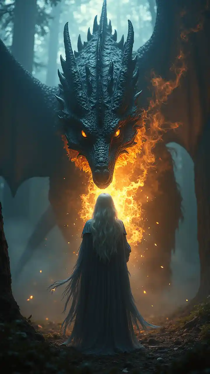 Seorang penyihir berambut perak yang mengesankan berdiri dengan tenang di hutan yang gelap dan berkabut, jubahnya yang mengalir menyatu dengan bayangan. Di belakangnya, naga raksasa melepaskan aura yang kuat — baik jeram es atau api emas yang menderu — yang menerangi sekitarnya. Mata naga yang bercahaya dan sisik hitam obsidian yang halus berkilauan di udara yang diresapi dengan sihir, dengan bara api dan kabut yang berputar-putar di sekitar mereka. Atmosfer intens, epik, magis – gaya fantasi tinggi, pencahayaan teater super detail dengan efek elemen dramatis.