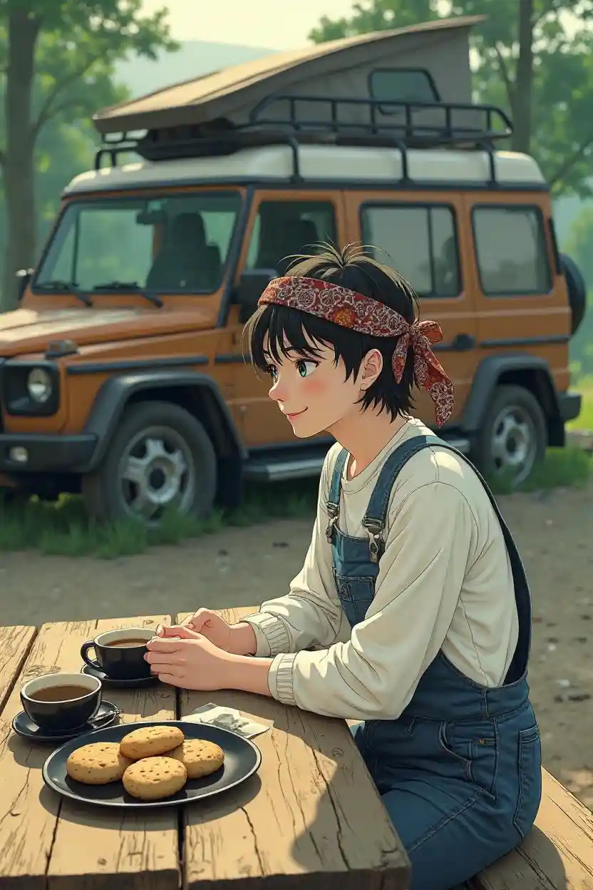 Gaya manga Jepang tahun 90an, pagi-pagi sekali di sebuah perkemahan dengan latar belakang mobil Mercedes G-Class tourer jadul. Seorang pria muda dengan rambut hitam pendek, mengenakan bandana bermotif paisley yang dipajang dari samping, duduk di meja piknik kayu pedesaan. Dia mengenakan kemeja putih lengan panjang dan celana bib denim. Sudut kamera melihat dari atas, menunduk padanya, dan dia tersenyum lembut. Di depannya, ada piring hitam dengan tiga biskuit dan cangkir kopi hitam tanpa tutup tanpa pegangan. Cahaya pagi yang lembut melemparkan bayangan lembut, menciptakan suasana yang tenang dan damai dengan kemping Jeep di belakangnya.