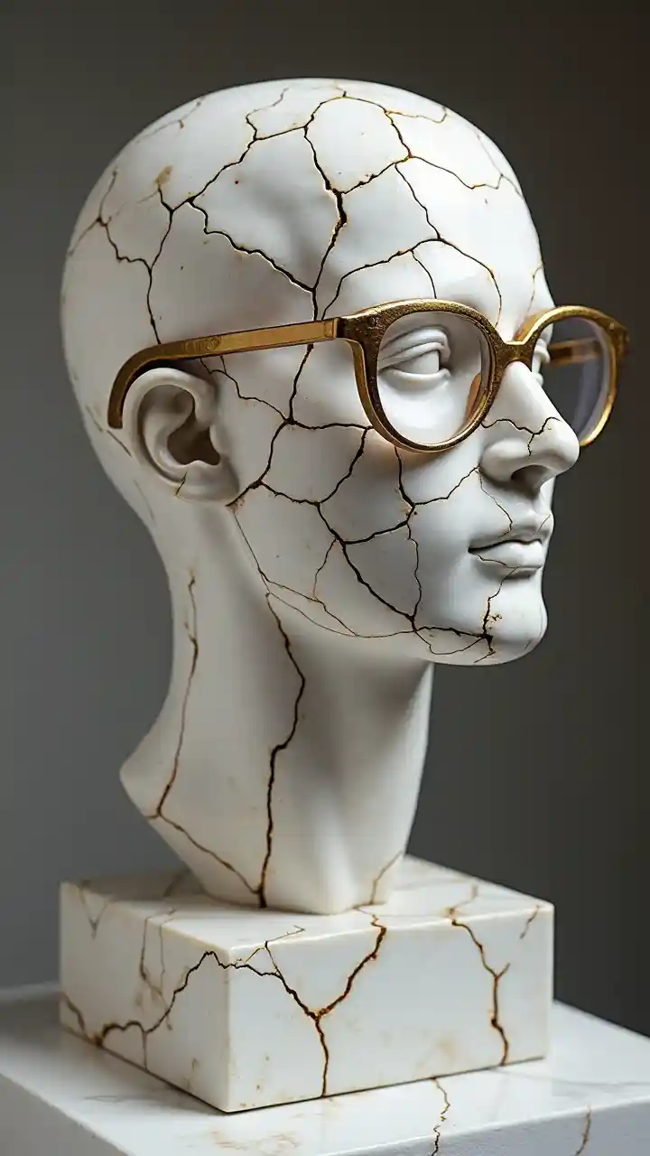 Patung marmer retak di kepala pria dengan kacamata, Gunakan wajah di foto yang diunggah, Patung di atas meja, Emas dan emas gelap retak marmer putih, Pencahayaan studio, Foto profesional, Latar belakang lembut, Referensi klasik artistik