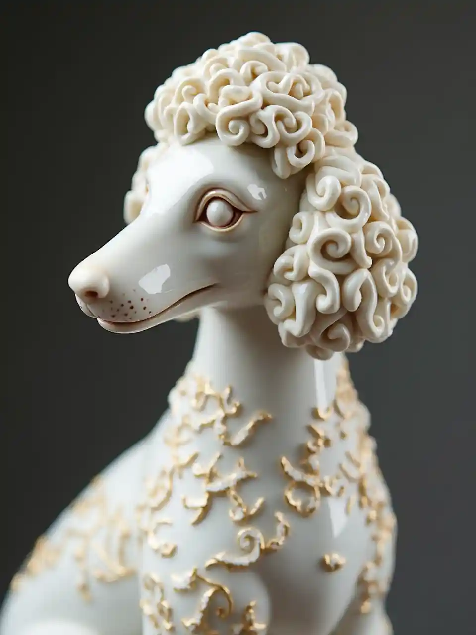 Memotret seluruh tubuh patung marmer yang indah, hiasan kepala anjing pudel klasik dengan rambut simpul atas yang rumit, menjadi standar dalam seni porselen dengan detail yang halus dan tekstur yang halus. Patung memiliki latar belakang marmer putih mengkilap, dihiasi dengan pola emas yang rumit yang memperkaya keindahan keseluruhan. Ekspresi karakter tenang dan mulia, menangkap rasa ketenangan yang khas dalam seni porselen. Tiara anjing yang elegan dikombinasikan dengan detail rumit dari pola mantelnya untuk menciptakan mahakarya estetika estetika berkualitas tinggi