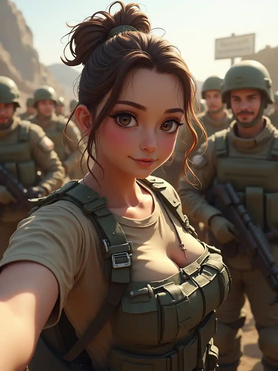 Digital Concept Art, POV, Selfie, Group Selfie, Selfie dengan tim tentara, Side Shot, Close-up, Gadis tentara bayaran cantik dengan tubuh tebal dan tubuh panas mengenakan kaos krem, dada besar, mengenakan pelindung tubuh kapal induk papan tebal, sanggul hitam, di pangkalan militer, kepala menghadap ke sisi lain, mata melihat ke kamera, senyum lucu, bayangan kontras, sinar matahari, pencahayaan dramatis, hi res, detail rumit, wajah detail, armor detail, rambut rumit, Detail mata, UHD, 8K