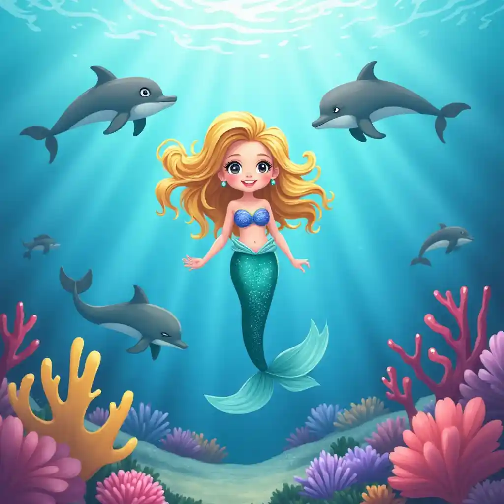 ColtenKartun putri duyung, berambut pirang dan berekor biru, berenang di bawah air bersama lumba-lumba dan karang warna-warni.