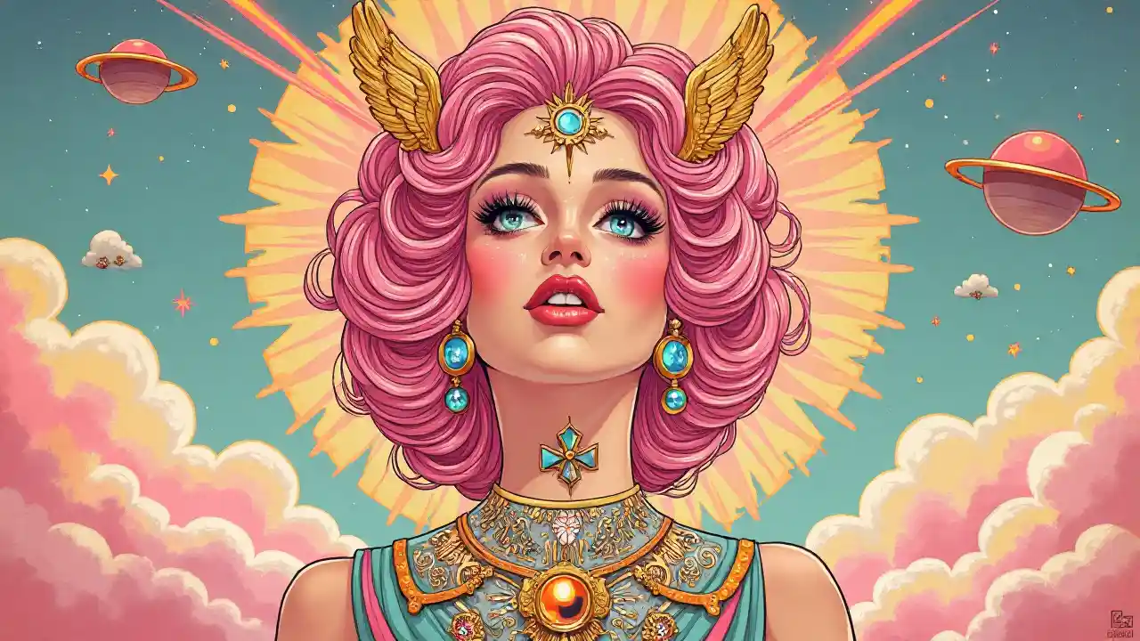 Sebuah super-bergaya, potret hiper-ilustrasi Merry yang menggambarkan retro Futuristi psychedelic universe priestess - seorang wanita ramping bercahaya dengan liar, gaya ikal merah muda anti-gravitasi dan mata biru berkilauan, menyajikan gaya ilustrasi analog yang lembut dan kasar, mengingatkan pada tahun 1960-an sci-fi paperback dan sampul majalah vintage. Rambutnya mekar seperti nebula dalam gelombang roller vintage, dikelilingi oleh mahkota sayap emas bertatahkan prisma pelangi dan teknologi kristal yang terukir seperti sirkuit sakral. Mata ketiganya, dengan permata lensa bercahaya bertatahkan Starburst emas di dahinya, memancarkan denyut cahaya lembut. Sinar pelangi keluar dari matanya yang besar yang dibasahi dengan garis mata – bulu mata vintage pertengahan abad mekar secara dramatis. Cahaya dibiaskan melalui stardust vektor bergaya dan cincin planet pin. Dia mengenakan kerah pakaian antariksa vintage yang didesain ulang menjadi kalung kosmik bertatahkan permata, lengkap dengan permata buatan manusia yang besar dan artefak logam fotoreaktif yang menangkap flare merah muda dan emas. Di belakangnya, warna merah muda dan hijau muda menyebar seperti mandala matahari terbit, bertekstur dengan warna half tone yang lusuh dan cetakan vintage yang memudar. Langit latar belakang adalah warna matahari terbenam campuran lembut yang memudar dan awan fantastis yang mengungkapkan galaksi kolase dan gerbang analog, dihiasi dengan siluet bintang atom dan UFO yang berkilauan. Gaya ilustratif: sampul bubur sci-fi 60s yang dilukis dengan tangan, dengan detail modern, bayangan poster, dan lapisan tekstur majalah yang lembut dan vintage. Medium: Ilustrasi digital yang mensimulasikan sablon sutra dan partikel Risograph. Mood: jutek, sakral, norak, ikonik. Membayangkan Barbara sebagai oracle spiritual, ia bertemu Lissa Frank dalam pencarian visi. Kata kunci estetika: simulasi futurisme, sci-fi suci, okultisme flamboyan, idealisme pop pastel, kamp alam semesta bergambar.