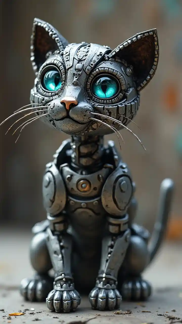 Seekor kucing yang terbuat dari besi tua, mur, baut, sekrup dengan desain yang canggih, super detail, mata biru kristal, aksi robot super realistis, mahakarya, kualitas terbaik, detail tinggi, realistis, kualitas foto, kualitas tinggi, (Realistis: 1.4)