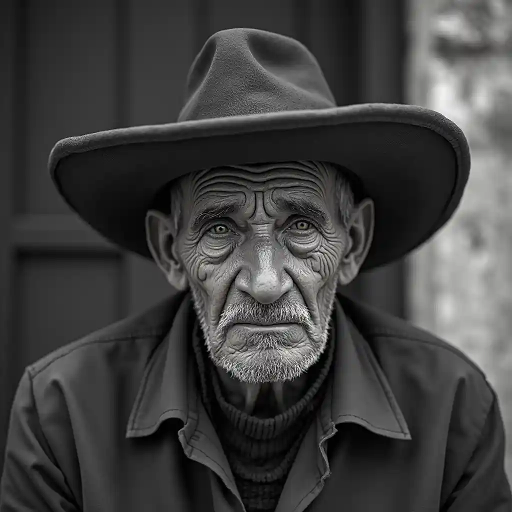 MadelynRetrato de Rostro de anciano de 98 a ñ os,de campo mexicano con mirada triste y cabizbaja en blanco y negro