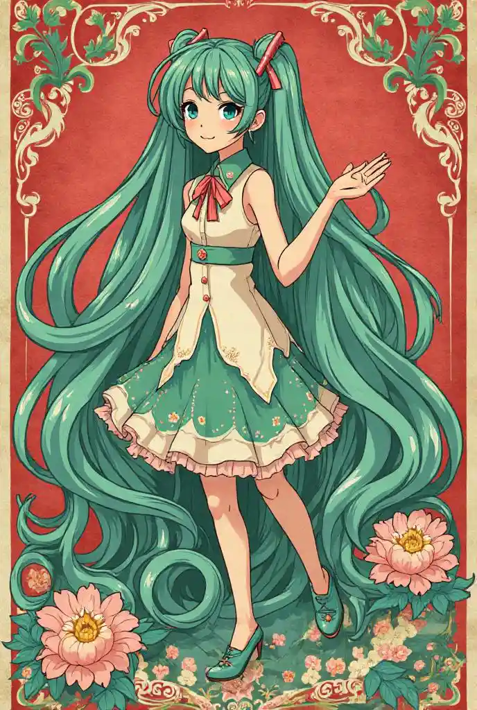Mucha style,Hatsune Miku,Old poster style,vintage style、Printed on paper
