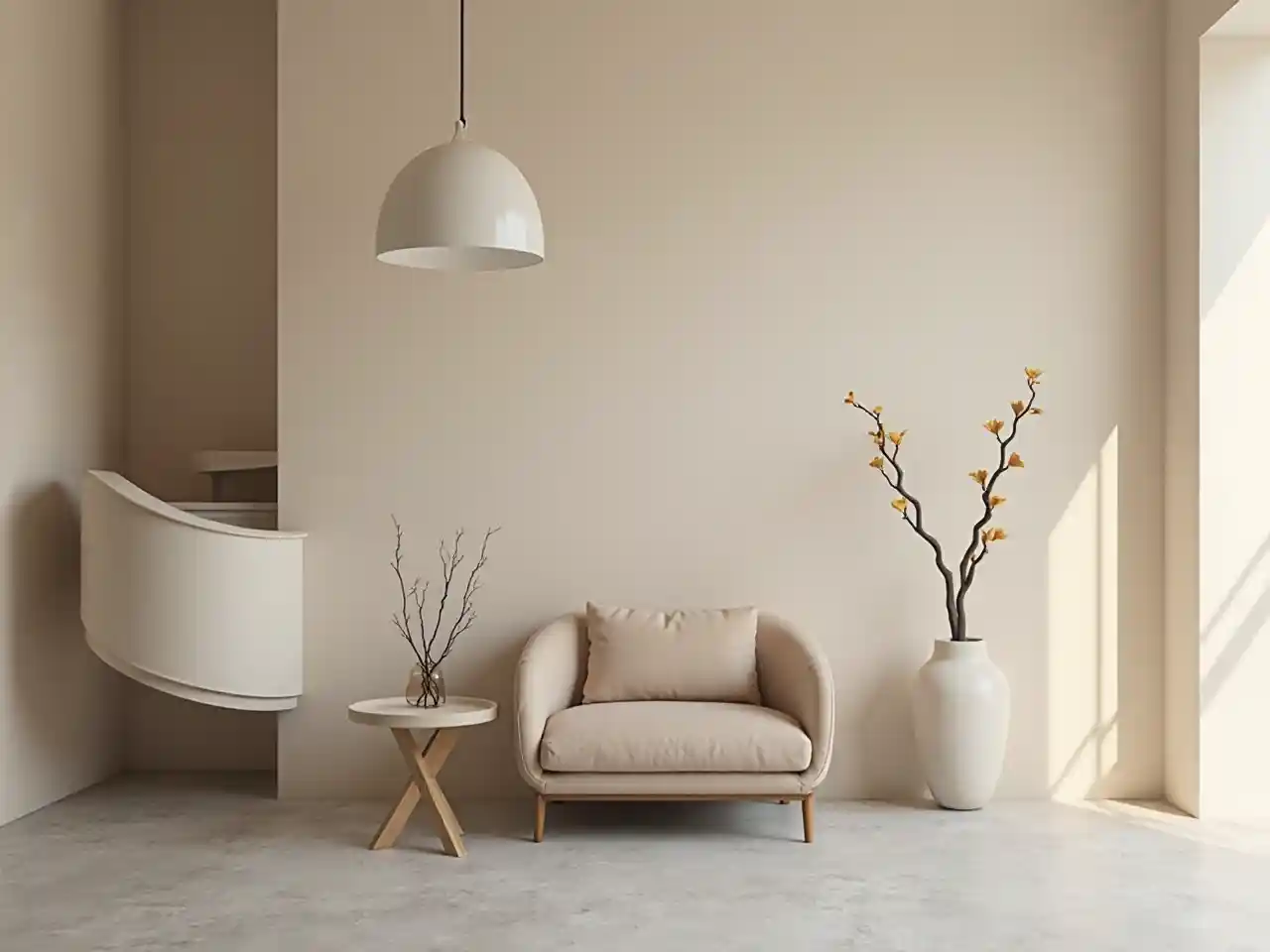 Desain interior minimalis apartemen dengan tangga melengkung dengan dinding krem lembut dan lantai beton. Penekanan ditempatkan pada sofa modern coklat muda di dekat dinding, dengan meja kecil dengan cabang dekoratif di bawahnya. Sebuah lampu gantung putih tergantung di atas untuk penerangan. Di depan tangga spiral, berdiri rak kosong lainnya. Ruang ini memancarkan ketenangan melalui dekorasi minimalis dalam gaya desain modernnya.