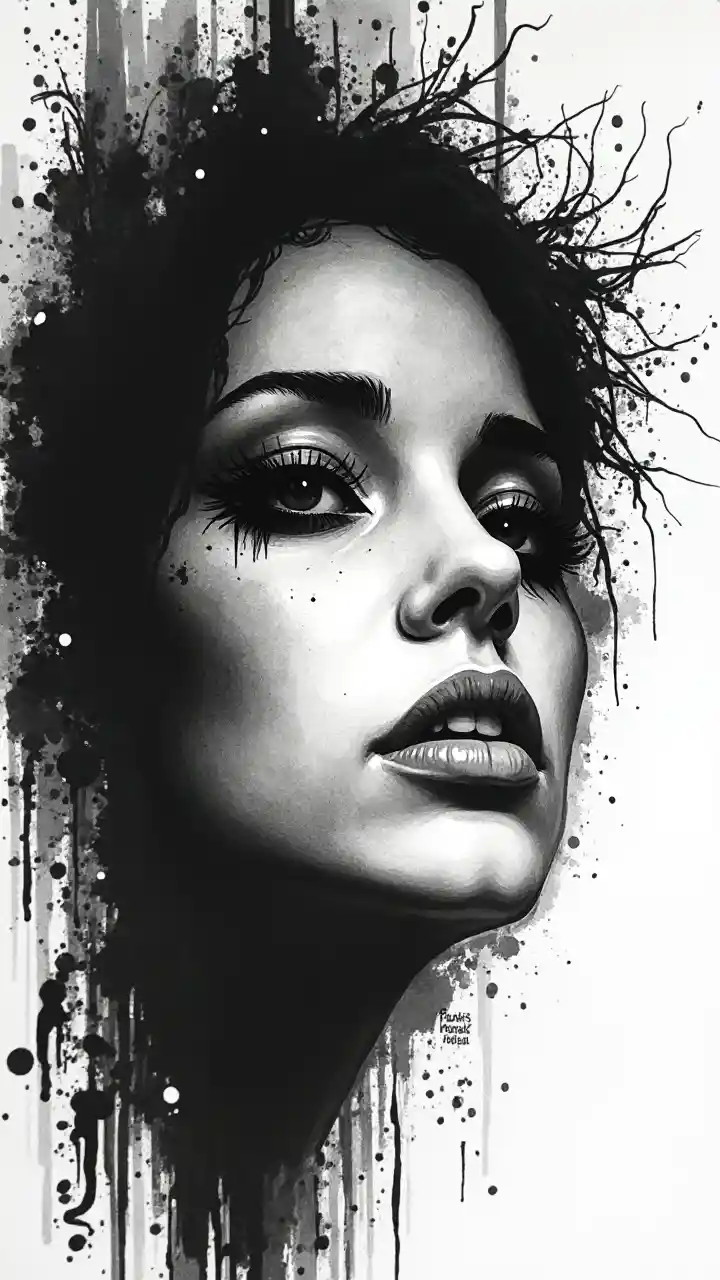 Lukisan hitam putih wajah wanita, terinspirasi dari pollock, tumblr, lukisan tinta eropa modern, seni alessandro potaso, trend art, detik-detik menegangkan, plato, ditulis dengan warna hitam putih, teror tinta tipis